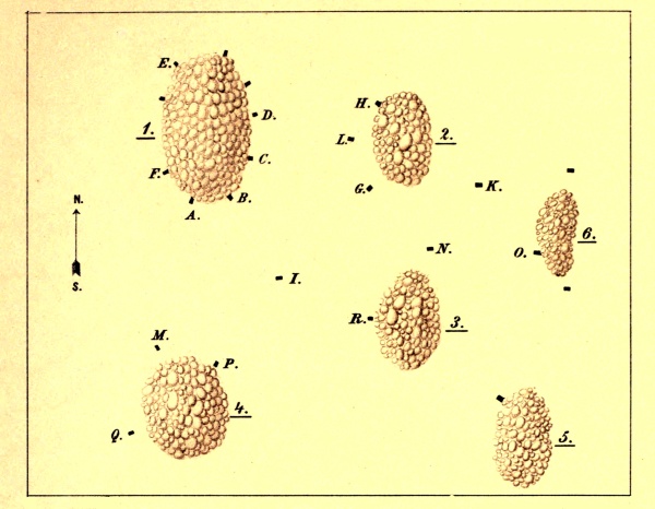 Due north of this cone, on the top of the above mentioned plateau, were six stone-mounds of oval form, but of very different size. The largest [Pg 14] (Pl. 41: 1) measured about fifty m. in length by thirty m. in breadth, the smallest (Pl. 41: 6) about fifteen m. in length by somewhat less than half in breadth. The greatest diameter of each mound was in N. and S. The stones of these mounds varied of course in size, but for the most part they were large, more or less cubical, from half a meter to one meter long and about half a meter broad. Their often regular shape and pretty plane sides, particularly in the mound 1, might lead one to infer that some of them have been hewn, and have formed the foundations and possibly also the walls of buildings, the ground plans of which are indicated by the form of the mounds and the situation of the statues, of which we are soon going to speak.