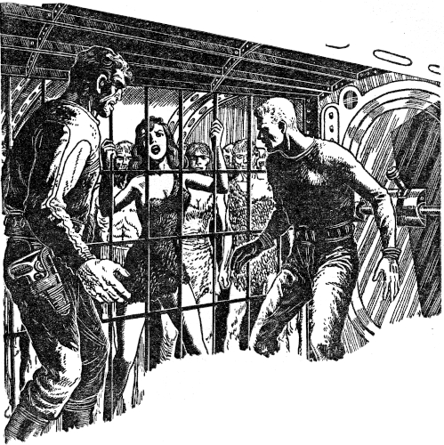 In the after hold Jenkins and his Number Two Gang were bracing a large metal cage. Entering behind Lodar, Ray stared with mingled feelings at the captives behind the bars.