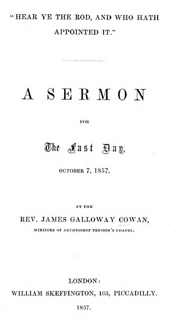 Christian Marriage Indissoluble. A plain Sermon preached at Archbishop Tenison’s Chapel, on the fifth Sunday after Trinity. By James Galloway Cowan, Minister of the Chapel. 4d.