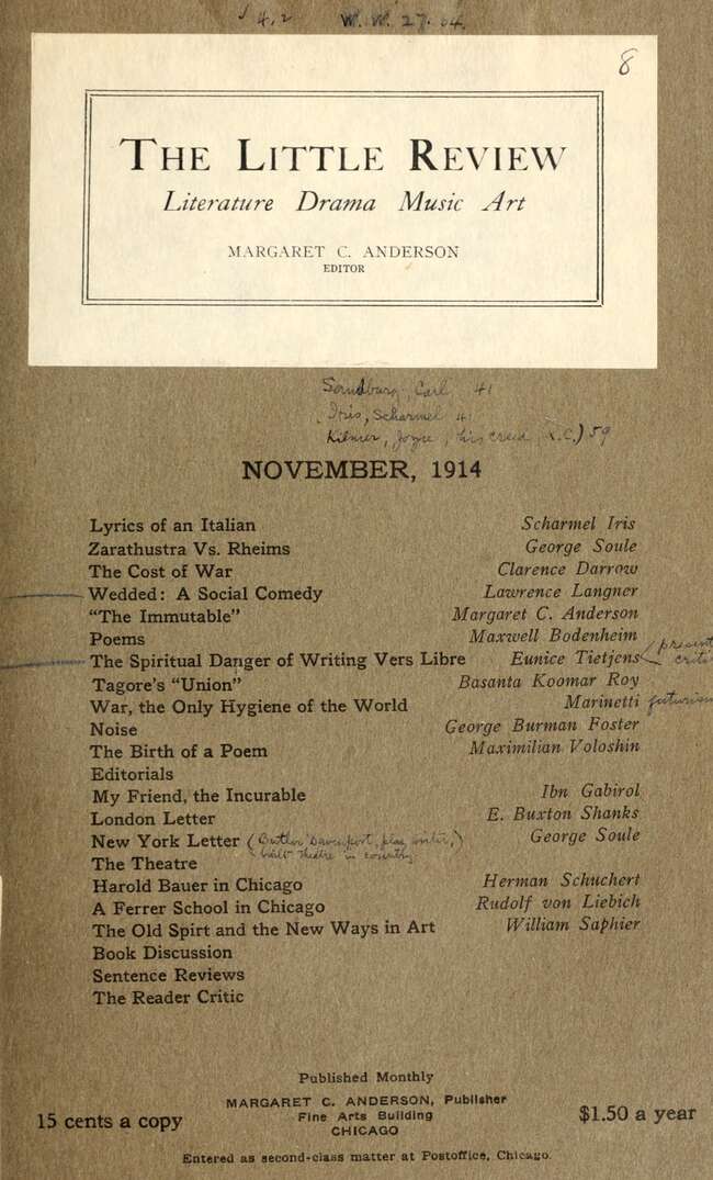 The table of contents on the title page was adjusted in order to reflect correctly the headings in this issue of The Little Review.