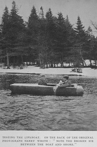 | Testing the Lifeboat. On the back of the original Photograph Harry wrote: “Note the broken ice between the boat and shore.”—This picture shows some of the difficulties in getting the Aeroplane to the Starting-Ground in Newfoundland. The Driver apparently took things lying down | 122 |
