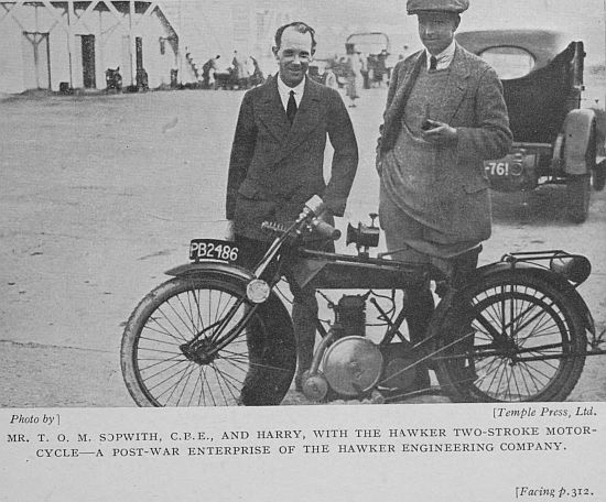 MR. T. O. M. SOPWITH, C.B.E., AND HARRY, WITH THE HAWKER TWO-STROKE MOTORCYCLE—A POST-WAR ENTERPRISE OF THE HAWKER ENGINEERING COMPANY.