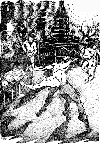 He ducked too late and took a right to his temple that set him spinning and seeing stars. A left cross spun him back and, by enraging him, cleared his head. He clinched to get breath, then flung the big radio man off and drove him against the table. Gates staggered and hung on under a rain of body blows, rallied to come back with a left and a right that both jolted Bonwitt's jaw. Then he was tearing at the engineer's eyes with clawed fingers, bearing him to the floor.