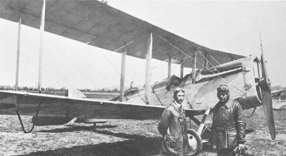 The famous De Haviland 4, British-designed observation plane of World War I. The ship shown here is an American version, built by the Dayton Wright Airplane Company in 1918 and powered with a Liberty engine. At left is Orville Wright, consultant for the company, shown with Howard Rinehart, a test pilot.