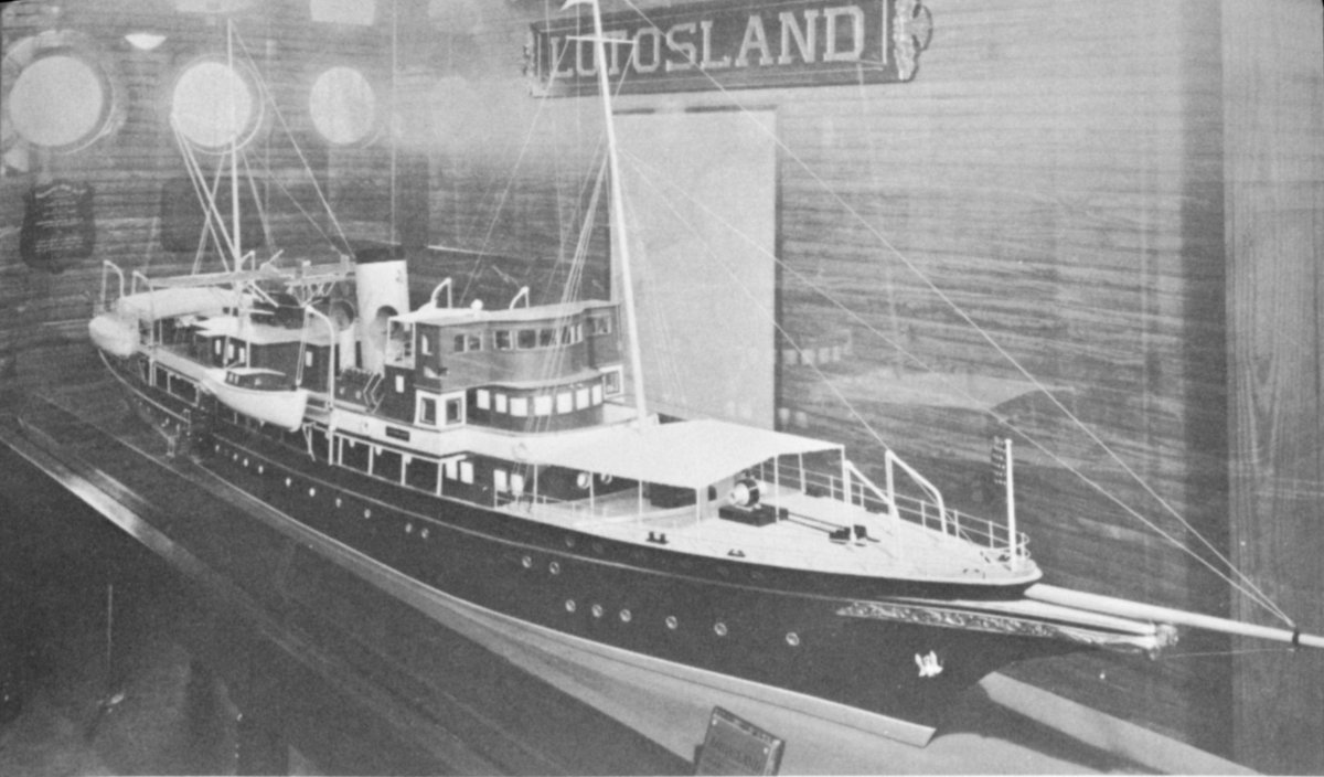 This is a model of the “Lotosland,” the yacht formerly owned by Colonel Deeds. It was placed in the exhibit as an example of maritime transportation.