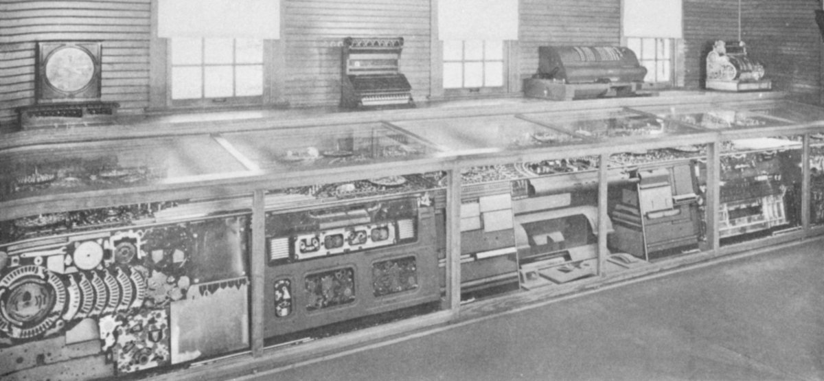 Inasmuch as C. F. Kettering and E. A. Deeds began their careers with The National Cash Register Company, it seemed fitting that some representation of that company’s products should be included in the barn display. The display includes early models of National cash registers and an impressive exhibit of the 20,000 parts which go to make up a modern National accounting machine.