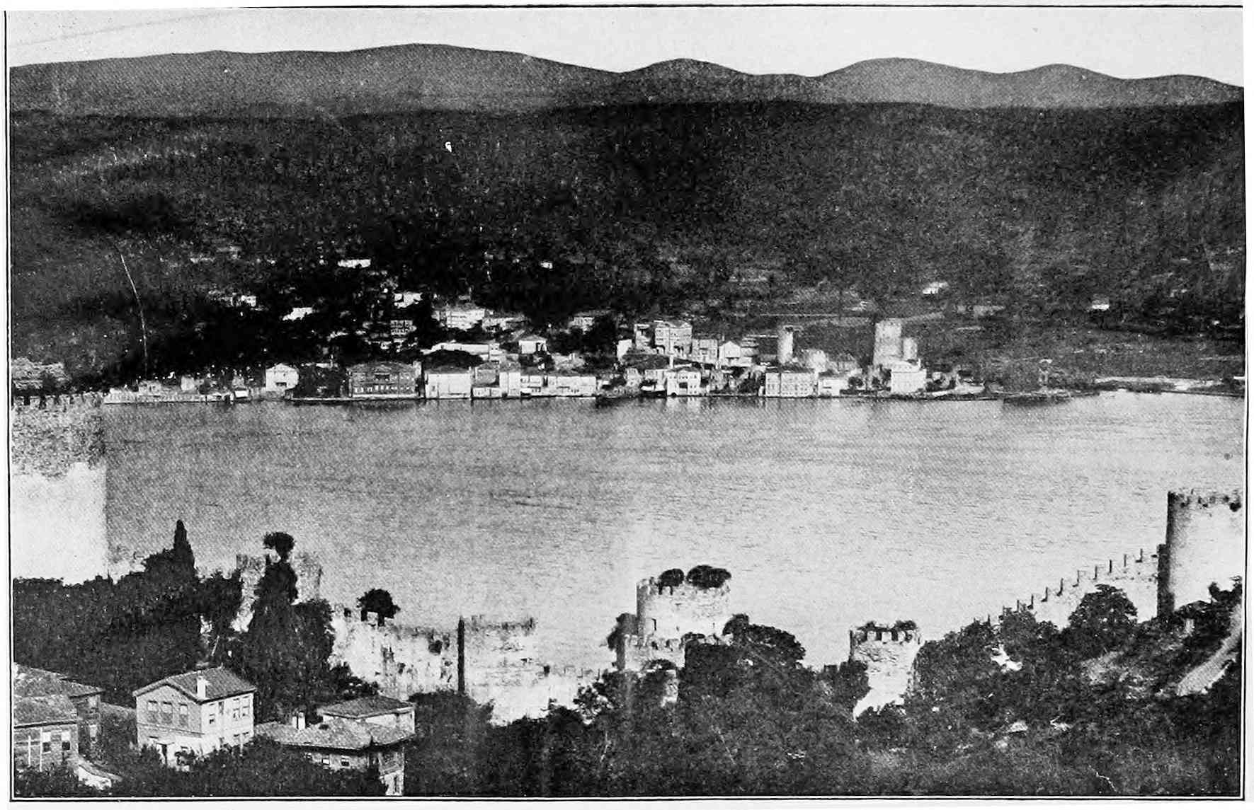Mohammed II selected this commanding point for the Rumili Hisar, a mighty castle which he built in the middle of the fifteenth century while he was besieging the city of Constantinople. Immediately opposite, upon the Asiatic shore of the Bosphorus, a similar castle was erected, and the two commanded the passage so that every ship passing up and down was compelled to pay toll. Mohammed called this castle Boghag Kessen (Throat Cutter), for he had a very pleasant way with him. The ruins are as picturesque and extensive as any in Europe, and the towers are almost perfect after nearly 600 years, although the floors and ceilings have long since fallen through. The walls have crumbled and much stone has been taken away for building material. They were originally thirty feet thick and thirty feet high and were built with the greatest haste and energy. Mohammed employed 1,000 masons, 1,000 lime burners, and 10,000 labourers in the construction, and to each mason was assigned the task of building two yards of wall in three months. By this division of labour and responsibility the work was completed in the time named by the ingenious designs of the engineers, and the outline of the walls forms the Turkish word “Mahomet.”