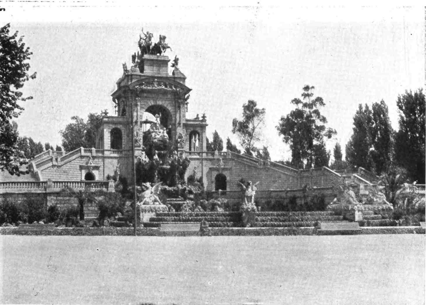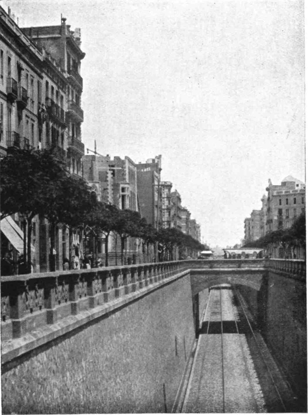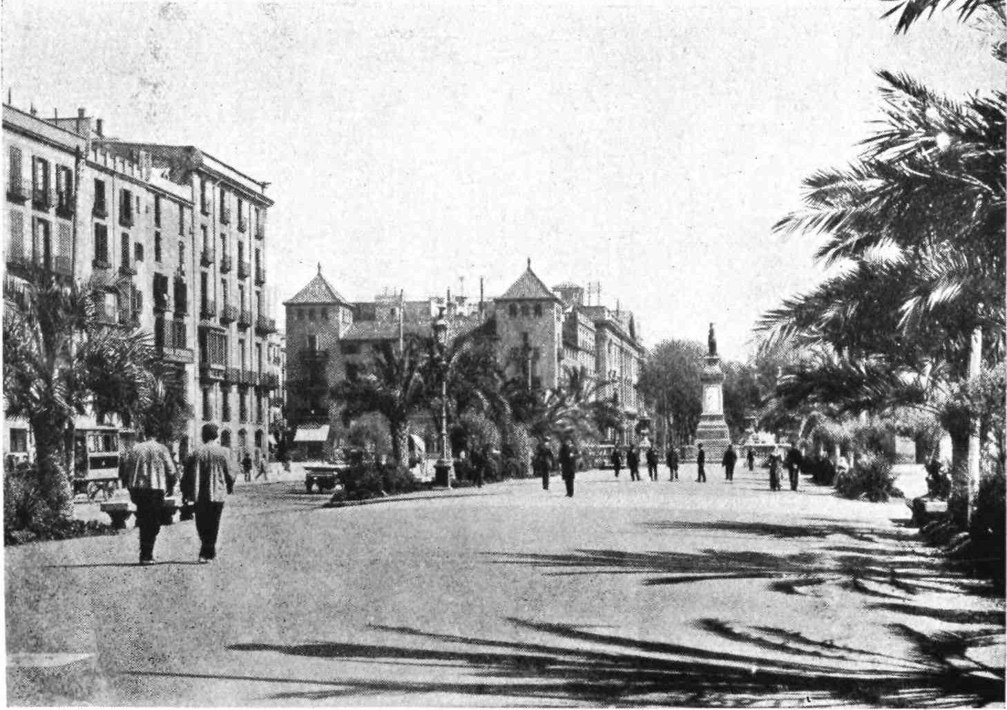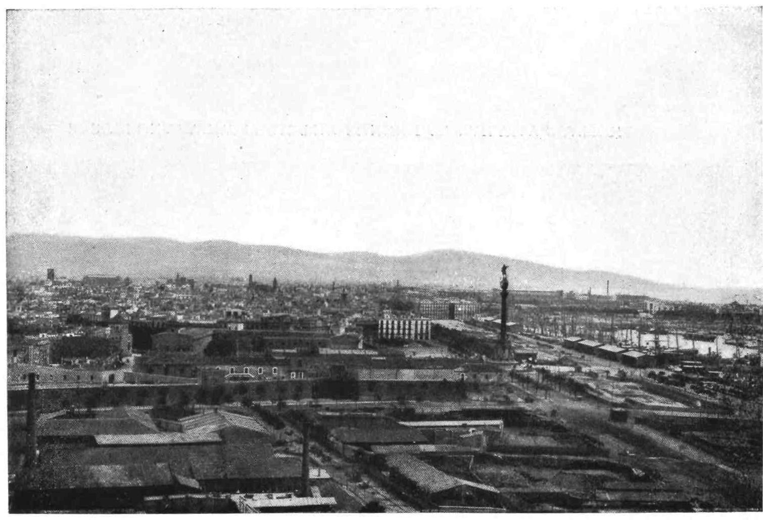 Barcelona has remained true to her traditions. She is still, as of old, a city of merchant princes, a hive of industry, at once the Liverpool and Manchester of Spain. To those who visit the capital of Catalonia after an acquaintance only with the moribund cities of Old Castile, this vision of España Moderna comes as a shock and a revelation. The first impression is not pleasing. You approach the city through a vast wilderness of suburbs, teeming with life, and breathing apparently through grimy factory chimneys. We realise that we have returned to the civilised twentieth century. But the brighter side of modernity is soon revealed. In its heart Barcelona is clean, bright, and spacious. The boulevards are unequalled in Europe—except perhaps by Budapest—and the street prospects are worthy of Washington. The Rambla is the most delightful of promenades; in the Calle Fernando the contents of every shop window tempt the unthrifty. A noble, beautiful modern metropolis, still worthy of Cervantes’ encomium: “Flor de las bellas ciudades del mundo, honra{9} de España, reglo y delicia de sus moradores, y satisfacción de todo aquello que de una grande famosa, rica, y bien fundada ciudad, puede pedir un discreto y curioso deseo.”