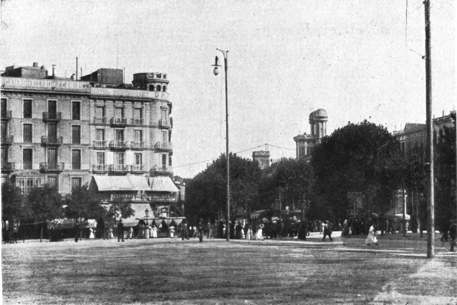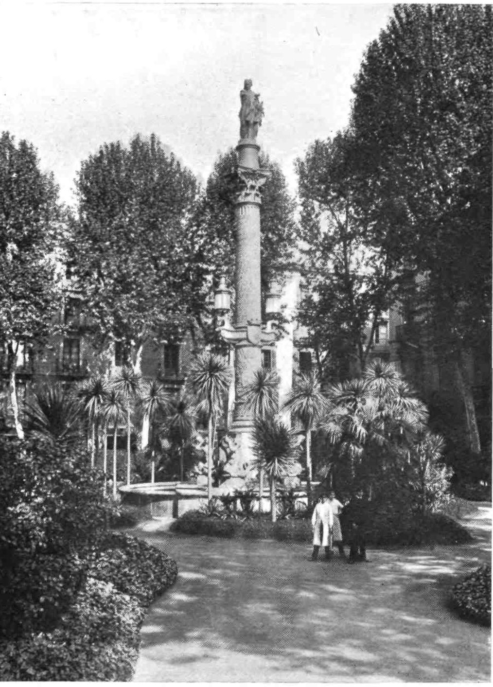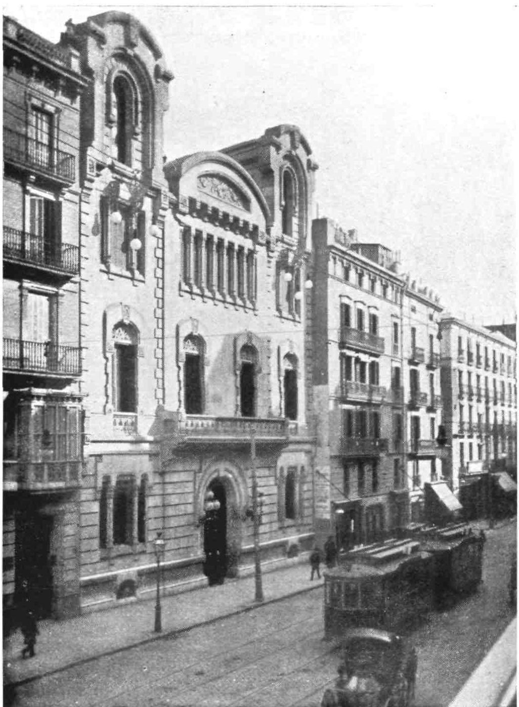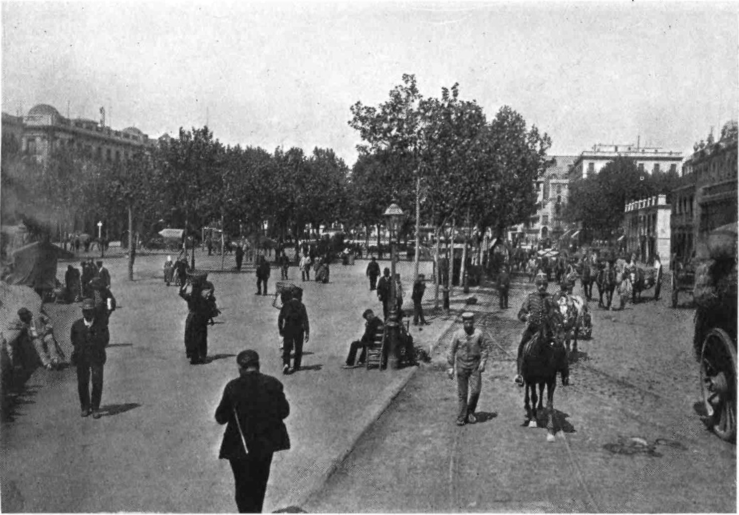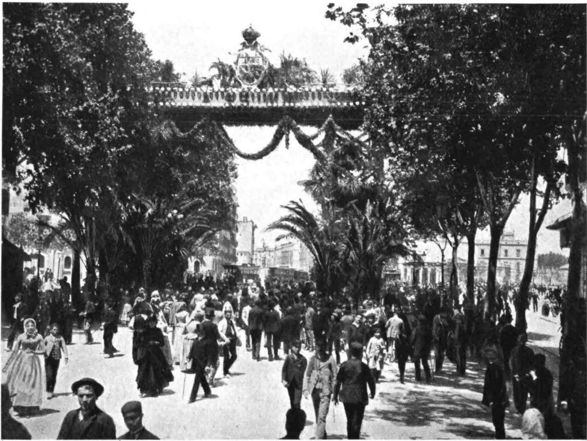 Barcelona has remained true to her traditions. She is still, as of old, a city of merchant princes, a hive of industry, at once the Liverpool and Manchester of Spain. To those who visit the capital of Catalonia after an acquaintance only with the moribund cities of Old Castile, this vision of España Moderna comes as a shock and a revelation. The first impression is not pleasing. You approach the city through a vast wilderness of suburbs, teeming with life, and breathing apparently through grimy factory chimneys. We realise that we have returned to the civilised twentieth century. But the brighter side of modernity is soon revealed. In its heart Barcelona is clean, bright, and spacious. The boulevards are unequalled in Europe—except perhaps by Budapest—and the street prospects are worthy of Washington. The Rambla is the most delightful of promenades; in the Calle Fernando the contents of every shop window tempt the unthrifty. A noble, beautiful modern metropolis, still worthy of Cervantes’ encomium: “Flor de las bellas ciudades del mundo, honra{9} de España, reglo y delicia de sus moradores, y satisfacción de todo aquello que de una grande famosa, rica, y bien fundada ciudad, puede pedir un discreto y curioso deseo.”