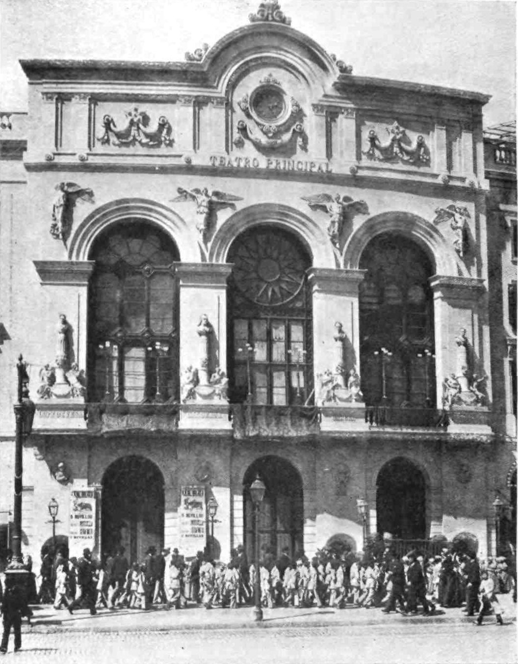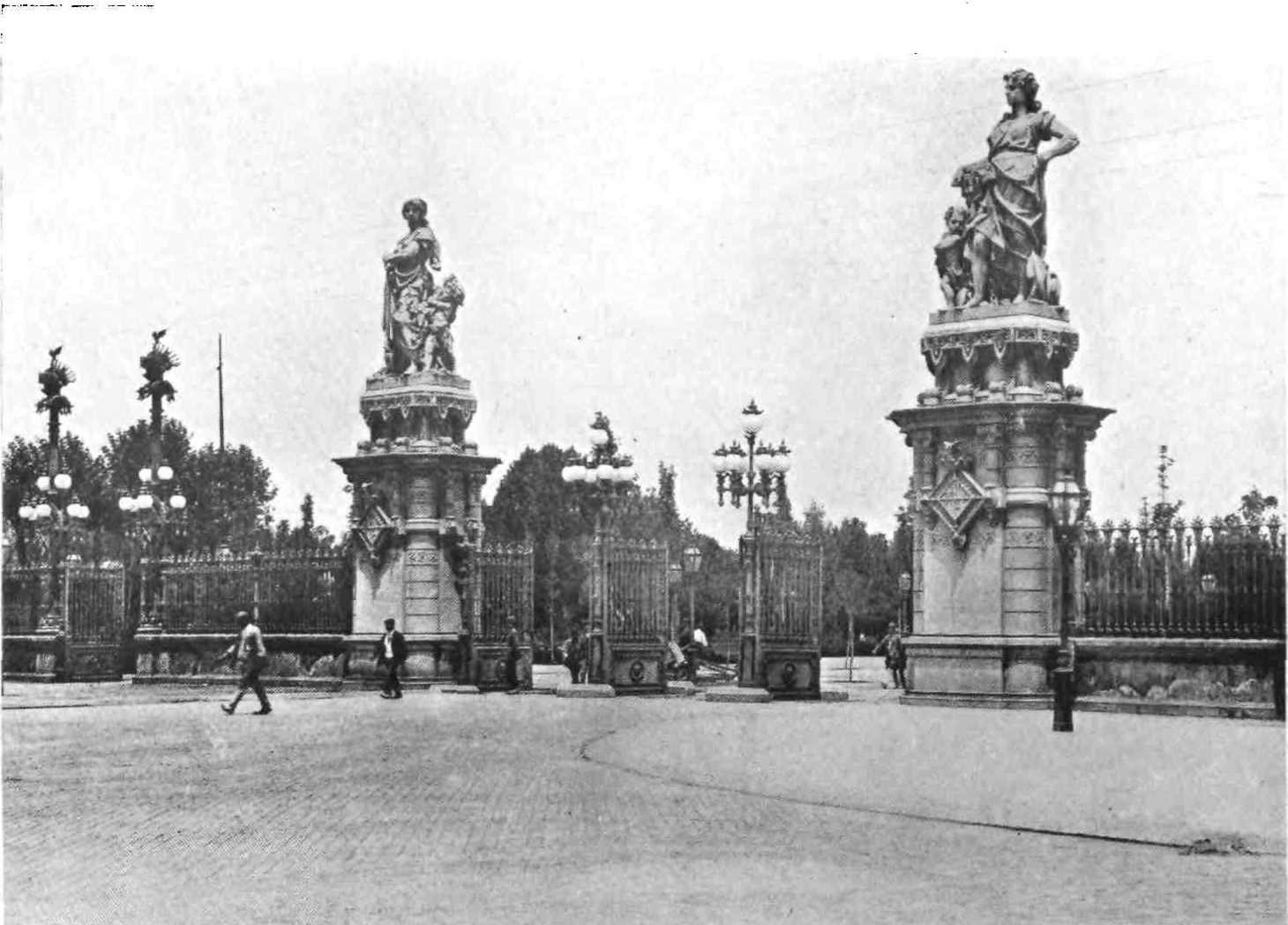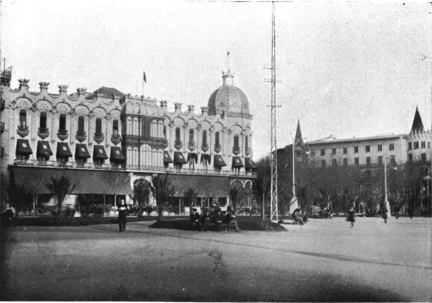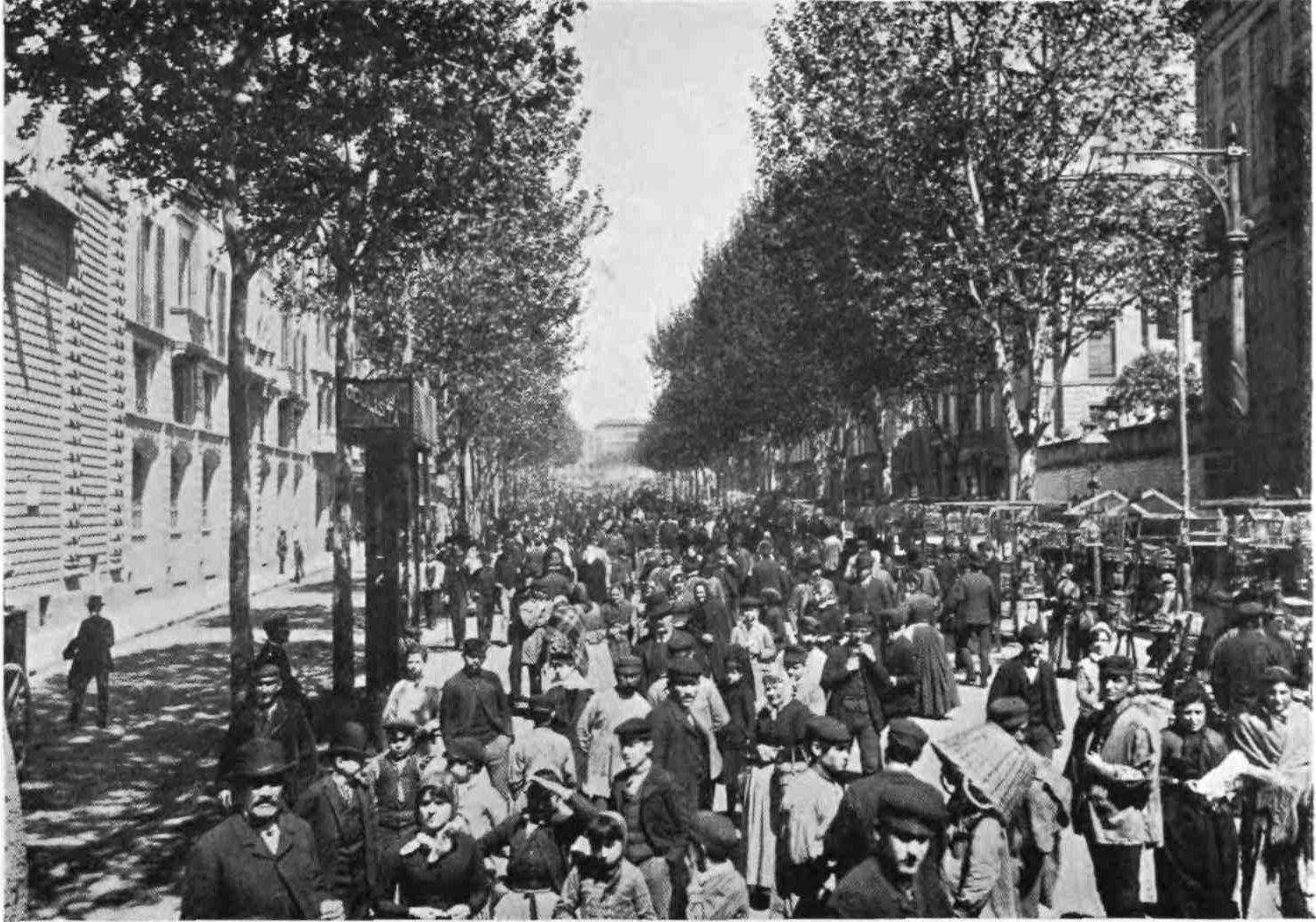 Barcelona has remained true to her traditions. She is still, as of old, a city of merchant princes, a hive of industry, at once the Liverpool and Manchester of Spain. To those who visit the capital of Catalonia after an acquaintance only with the moribund cities of Old Castile, this vision of España Moderna comes as a shock and a revelation. The first impression is not pleasing. You approach the city through a vast wilderness of suburbs, teeming with life, and breathing apparently through grimy factory chimneys. We realise that we have returned to the civilised twentieth century. But the brighter side of modernity is soon revealed. In its heart Barcelona is clean, bright, and spacious. The boulevards are unequalled in Europe—except perhaps by Budapest—and the street prospects are worthy of Washington. The Rambla is the most delightful of promenades; in the Calle Fernando the contents of every shop window tempt the unthrifty. A noble, beautiful modern metropolis, still worthy of Cervantes’ encomium: “Flor de las bellas ciudades del mundo, honra{9} de España, reglo y delicia de sus moradores, y satisfacción de todo aquello que de una grande famosa, rica, y bien fundada ciudad, puede pedir un discreto y curioso deseo.”