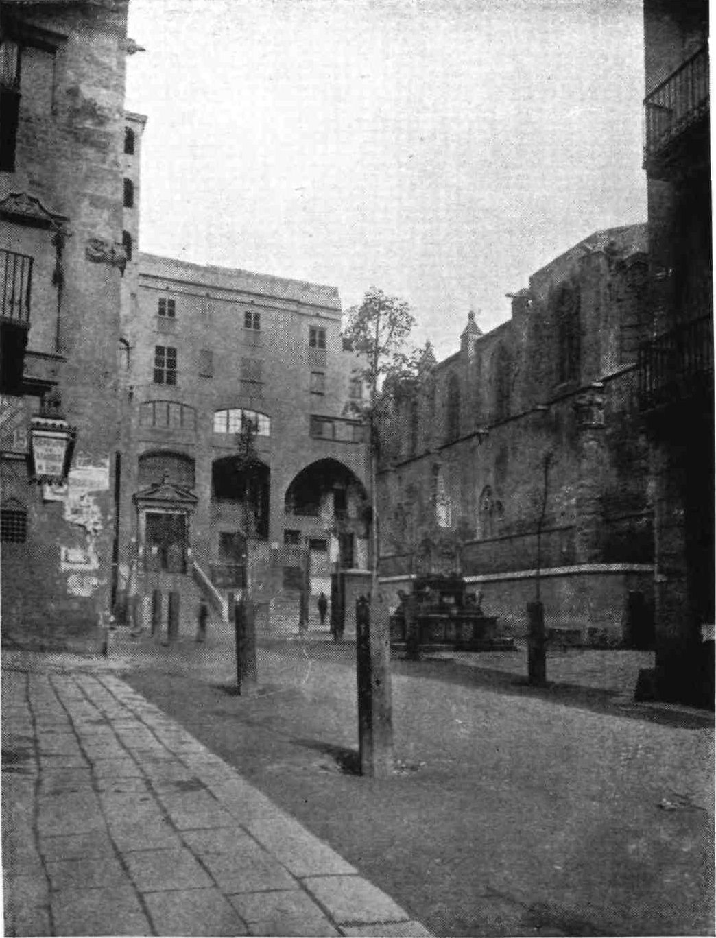 Santos Justo-y-Pastor is another single-nave church, founded in 1345, on the oldest church site in the city. It has been modernised inside and out. In the days of the ordeal by combat the parties, fully armed, made oath in this church, on the altar of San Felio, as to the justice of their cause and to use no “constellated or enchanted weapons.” We read that James I. declared null and void the issue of an encounter between Arnuldo de Cabrera and Bernardo de Cantellas on the ground that the one had worn certain jewels believed to be enchanted, and that the other had been invested with a shirt rendered impenetrable by a spell. To-day, I understand, an oath taken in this church as to the last wishes of a citizen who has died intestate, will be sufficient grounds for the issue of letters of administration accordingly. Here also Jews were sworn with both hands placed on the Decalogue, and according to a long and terrific formula. This is given at length by Don Pablo Piferrer in the original Catalan, and is calculated to appal the most hardened perjurer.