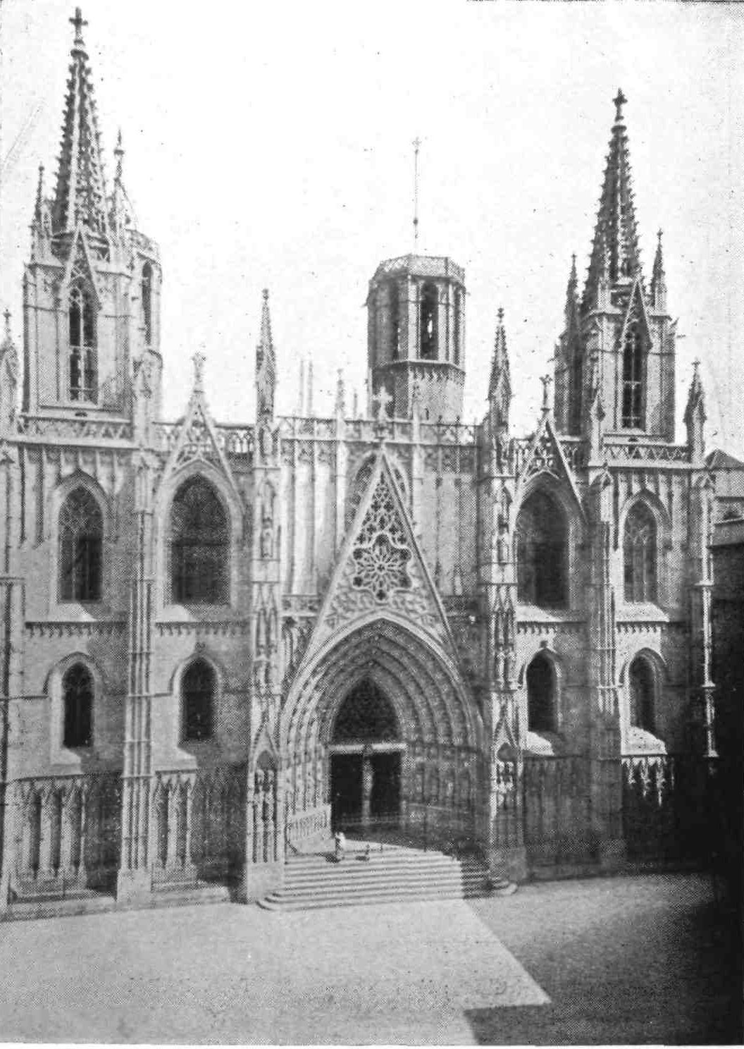 Barcelona is richer in monuments of the past than many a more ancient-looking city. Foremost among these is the Cathedral in the very heart of the town, one of the grandest examples of Gothic architecture in Spain. Its extreme sombreness and apparently massive character produce a similar impression to that created by the much larger Cathedral of Seville.