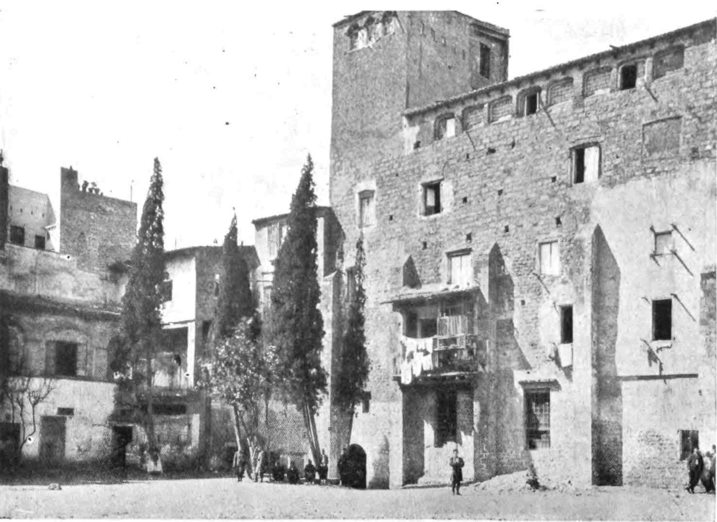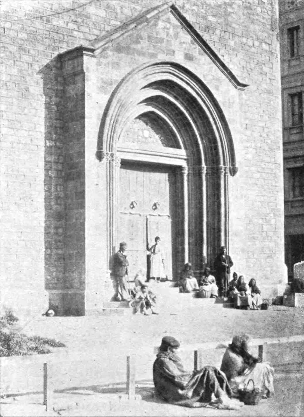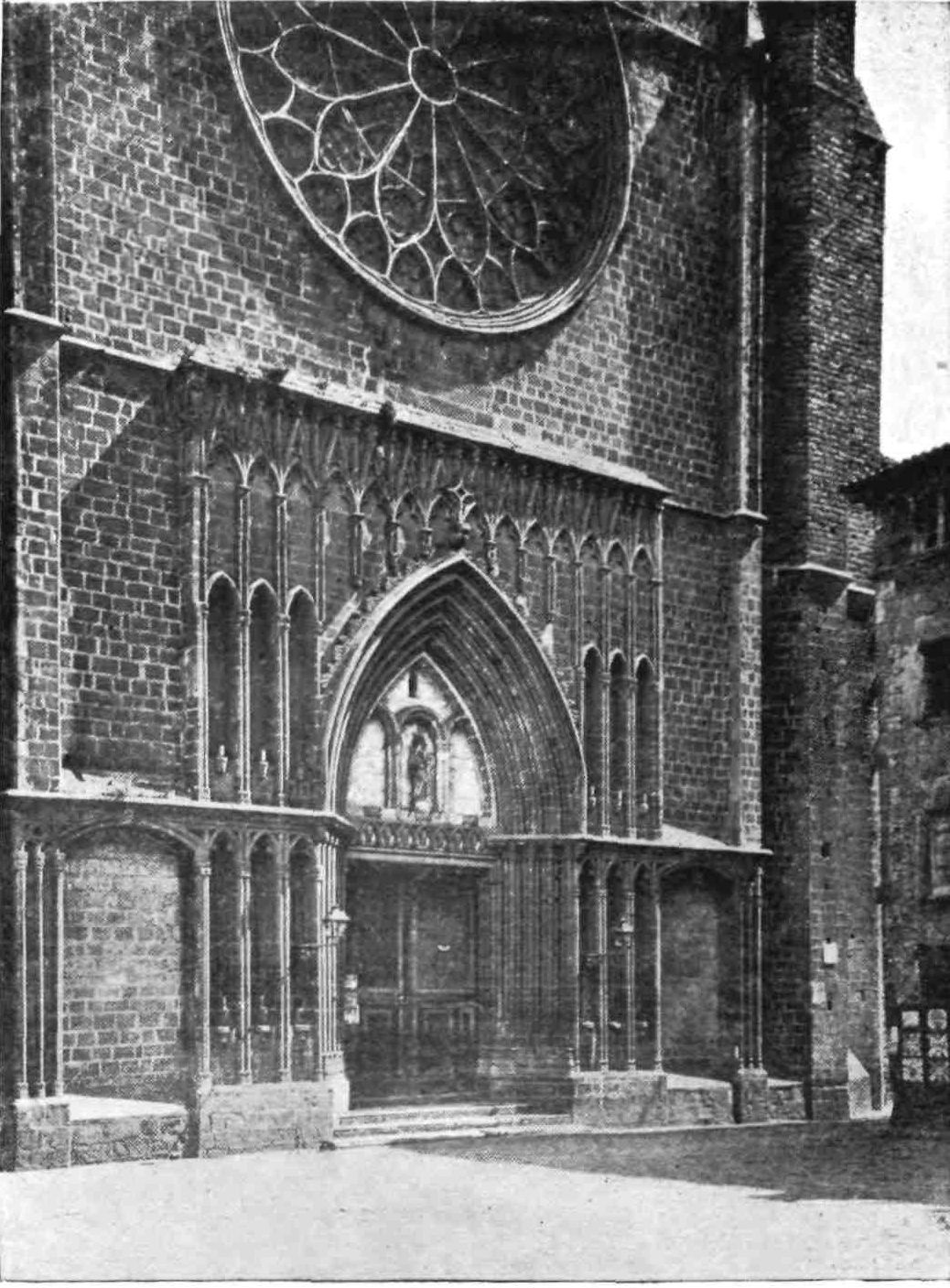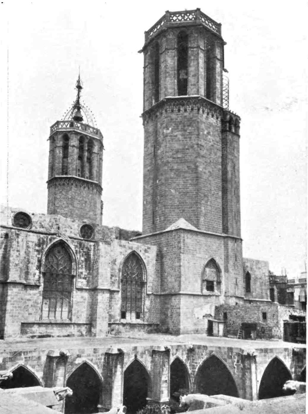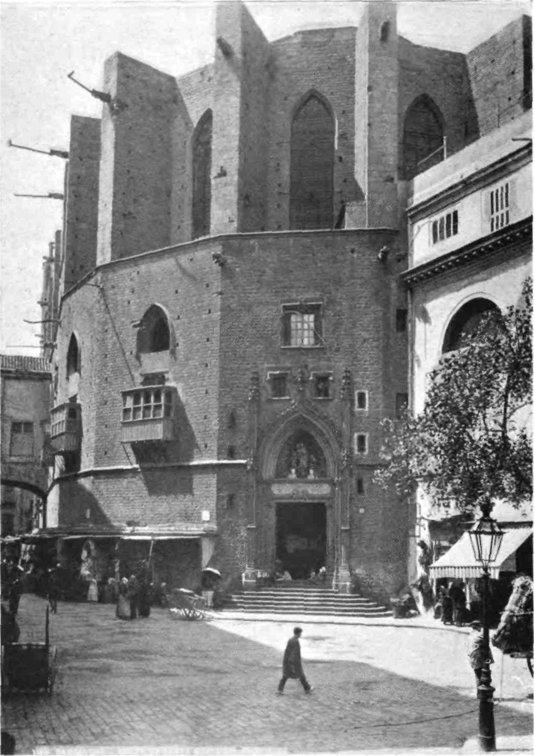 We presently pass the Bishop’s Palace, an eighteenth-century structure incorporating some late Romanesque arcading. But leaving other interesting buildings in this the oldest quarter of Barcelona for the moment, we will seek the next most notable church in the town, that of Santa Maria del Mar. It occupies the site of the earliest shrine of Santa Eulalia, over which Bishop Aetius built a temple in the thousandth year of our era. This modest church was replaced by another in the year 1329, which was restored and reconsecrated after a disastrous fire in 1383 under the reign of Pedro the Ceremonious. All classes of the community assisted in the work. Those who could not give money gave their labour, and in commemoration of this two small bronze figures carrying stone and timber adorn the principal door. The edifice is a good example of the Catalan church in its breadth and height of nave and simplicity of plan. Like the cathedral, it forms a parallelogram rounded at the east end, and presents an unbroken line of{16} wall to the exterior. Churches of this type usually consist of nave only, but Santa Maria del Mar has two aisles. Enormous octagonal columns carry the main arches and the groining ribs which all spring from their capitals. The wall rib towards the nave is carried up higher than the main arches, so as to allow space between them for a small circular and traceried clerestory window in each bay. The arches of the apse are very narrow, and enormously stilted. There are small windows above them, but they are modernised. The aisles are groined on the same level as the main arches, a few feet, therefore, below the vault of the nave, and they are lighted by a four-light traceried window in each bay, the sill of which is above the string-course formed by continuing the abacus of the capitals of the groining shafts. Below this are three arches in each bay, opening into side chapels between the main buttresses. Each of these chapels is lighted by a traceried window of two lights, and the outer wall presents a long unbroken line, until above the chapels, when the buttresses rise boldly up to support the great vaults of the nave and aisles.[A] The interior, though still simple and dignified, has been marred by modern restorations. Another peculiarity remains to be noted: the choir is placed{17} behind the high altar. Of this latter, a costly but churrigueresque erection, the less said the better. The royal pew in the south aisle, recalling the days when Barcelona was a capital, was connected with the palace by a gallery now destroyed. The church contains some good glass and examples of the art of Villadomat, a painter of whom Catalonia can boast. His fate was extremely sad: for the last seventeen years of his long life, he was paralysed in both hands.