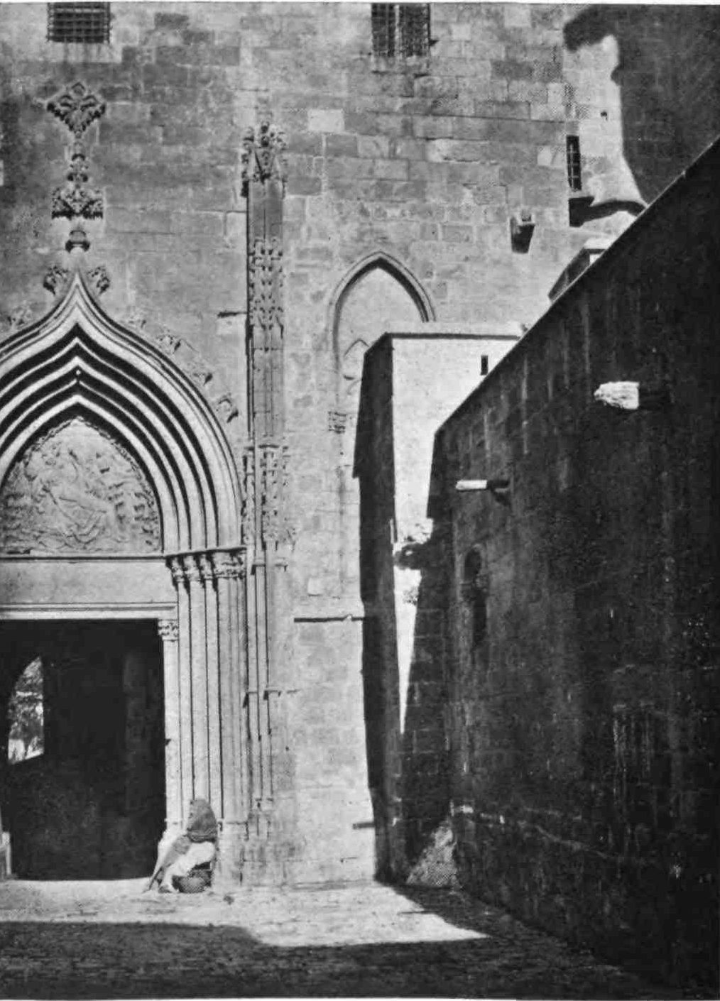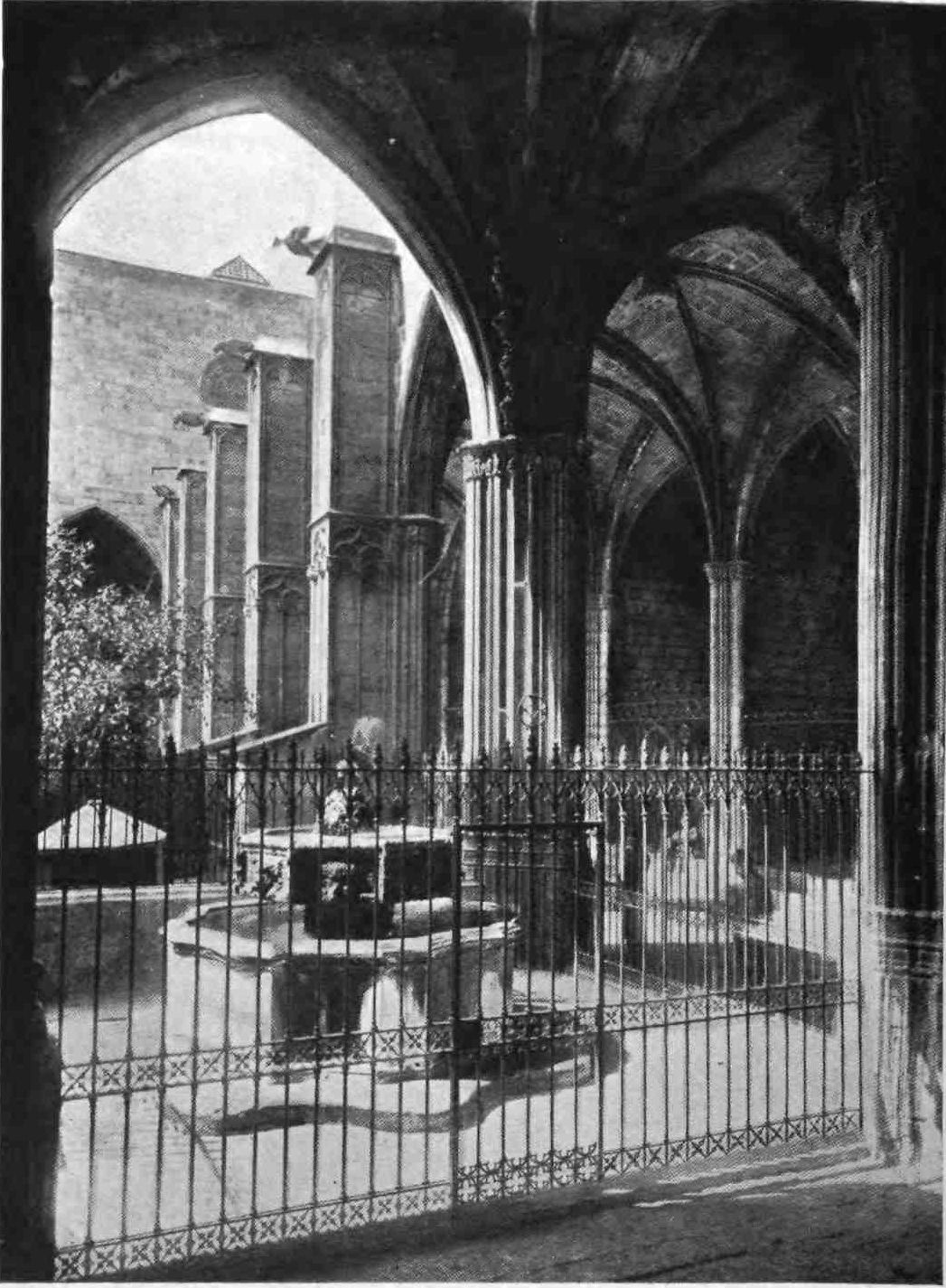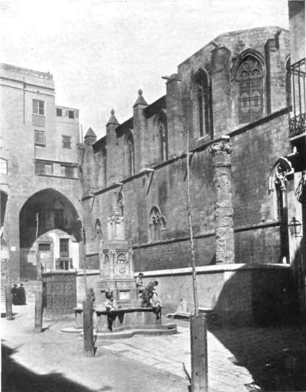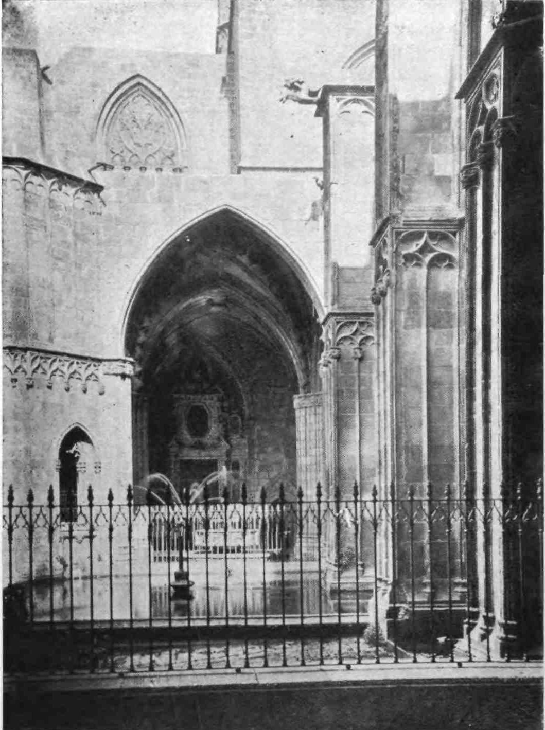 Cloisters are nearly always charming, and those adjoining the Cathedral on the south side are certainly so, with their palms and fruit trees and fountains. One of these last is adorned with a statue of St. George, a jet of water serving as a tail to the horse. In one corner is a goose-pond. I saw nothing of the cats who, Street says, were prowling about the cloisters and church, and contrived to get into the choir-stalls just before service, whence they were forthwith chased by the choristers and such of the clergy as happened to be there. I have witnessed such scenes in French churches, where they are very distracting to the devout. The cloister was begun by Master Roque and finished in 1448. The architecture has been variously criticised, and the tombs for the most part are poor. On these the profession of the deceased is indicated by the implements of his trade lightly graven. The resting-place of Mosém (Monseigneur) Borrà, the jester of Alfonso V. of Aragon, is distinguished by the cap and bells. In the Chapel of the Conception there used to be, says O’Shea, a picture painted by order of the municipality in gratitude for the cessation of the plague in 1651, at the intercession of the Virgin. The keys of the city, made in{15} silver, were presented to her on that occasion. In the chapel of Santa Lucia, at the south-west angle of the cloister, Street recognised a fragment of the old cathedral. The entrance into the south transept is of the same date. By the graceful Puerta Santa Eulalia we pass into the street.