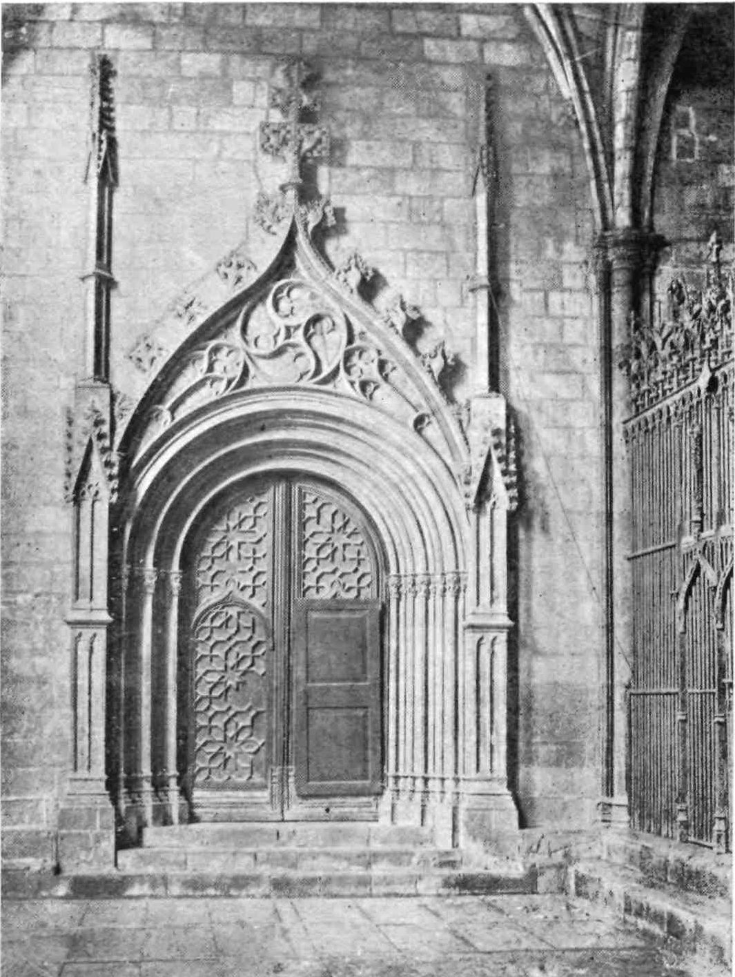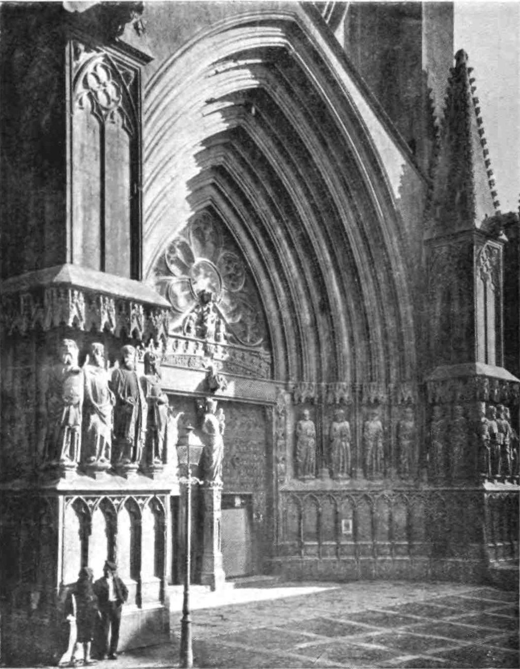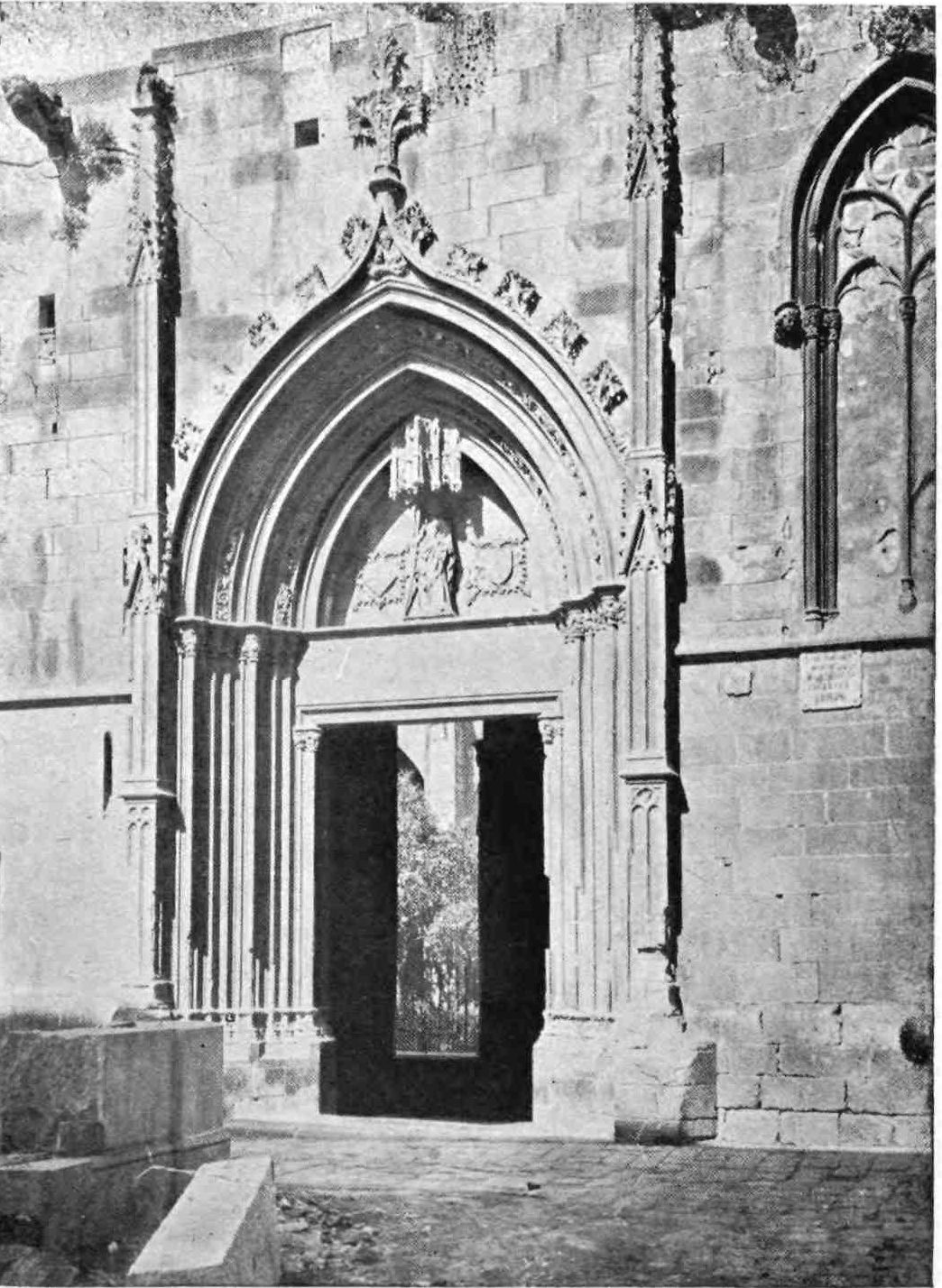 The principal portal, called in the Catalan dialect the Puerta dels Fillols, opens into the middle of the south aisle. “This [says our authority] is an example of singularly rich transitional work, with an archivolt enriched with chevrons, mouldings, dog-tooth, intersecting arches, and elaborate foliage. There is the usual horizontal cornice over the arch, and above this is a fourteenth-century statue of the Blessed Virgin Mary and Our Lord. The horizontal cornice is carried on moulded corbels, between which and the wall are carvings of wyverns and other animals; whilst the soffit of the cornice in each compartment is carved with delicate tracery panels, in some of which I thought I detected some trace of Moorish influence. The cornice has a delicate trailing branch of foliage; and the labels and two or three orders of the arch, in which sculpture of foliage is introduced, are remarkable for the singular delicacy and refinement of the{44} lines of the foliage, and for the exceeding skill with which they have been wrought. There is none of that reckless dash which marks our carvers nowadays, but in its place a patient elaboration of lovely forms, which cannot too much be praised. The mouldings here are all decidedly characteristic by a later—probably fifteenth-century—vaulted porch, which occupies the space between two added chapels. The effect is very good and picturesque.”