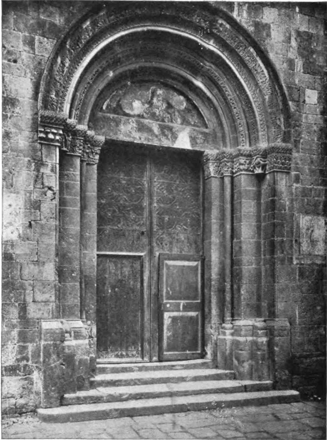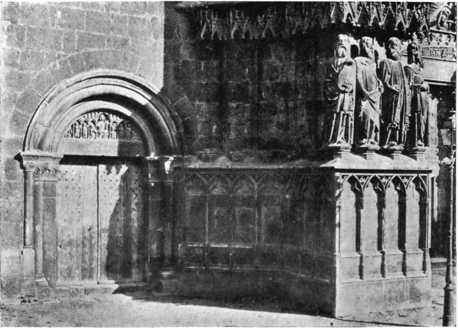 The façade on either side of this portal is similarly decorated with graphic reliefs in six courses, the lowest representing scenes in which{38} centaurs, lions, &c., figure; above this is a row of figures of knights, princes, and prelates; above this, battle scenes, then come two rows of sacred figures and subjects, and finally the figure of God the Father attended by angels and princes. The whole of this portal is of profound interest to students of the Romanesque.