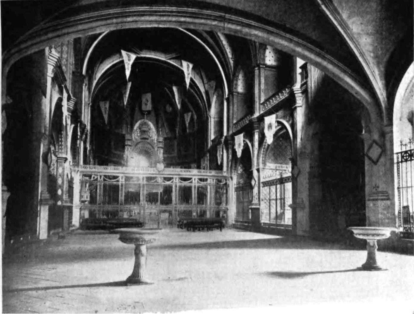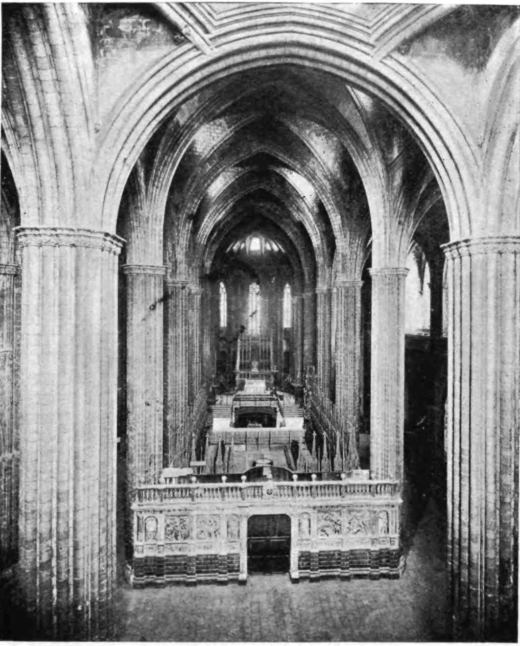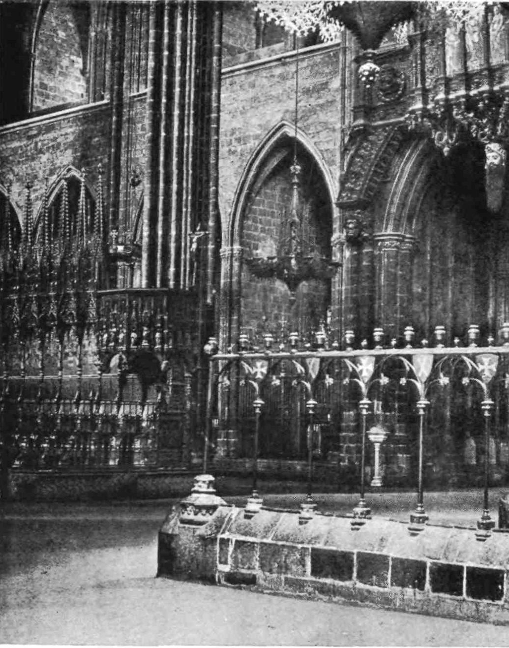 The high altar is of alabaster with a silver frontal, and belonged to the old cathedral. It was the gift of Ermesindes, the wife of Count Ramon Borel (1038). The reredos is a very rich and interesting work plated with silver. It was completed in 1348. The subjects in the three tiers of niches relate respectively to the lives of the saints, the life of the Blessed Virgin, and the life of Our Lord. The work is crowned by the figures of Christ and His Mother, and the saints Narcissus and Feliu. Of the same period is the baldachin, the vault of which is covered with sacred subjects, while the shafts are adorned with{28} heraldic achievements. Behind the reredos is the bishop’s throne, formed of a single piece of marble. “Here, when the bishop celebrated pontifically, he sat till the oblation and returned to it again to give the benediction to the people.”