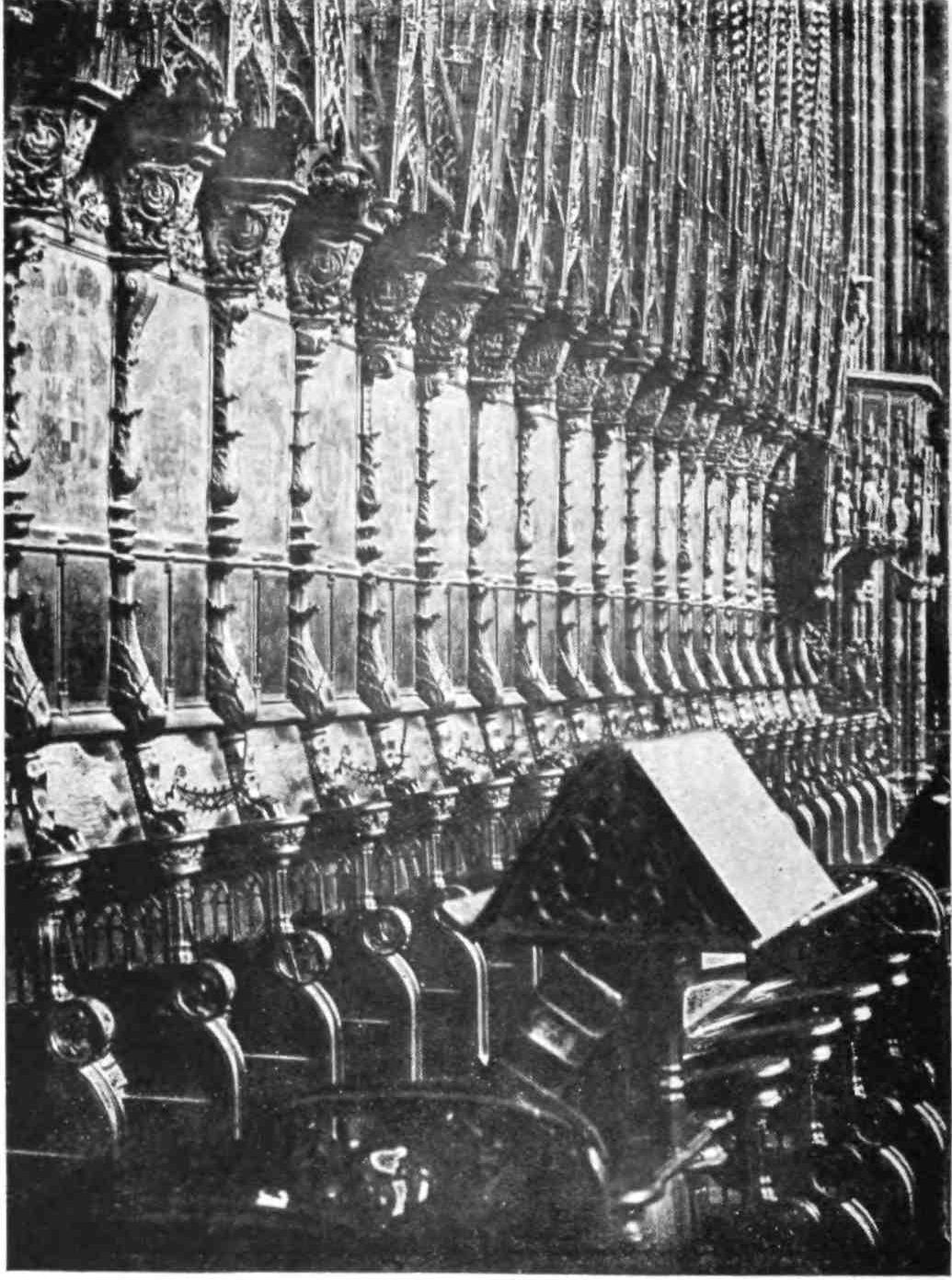 There is little remarkable about the High Altar. The choir-stalls are richly carved, and date from the late fifteenth century. Like the stalls of St. George’s Chapel at Windsor, they are decorated with coats of arms—those of the knights of the Order of the Golden Fleece, in commemoration of the chapter held here by Charles V. (then only King of Spain) in 1519. Among the Knights present were the Kings of Denmark and Poland, the Prince of Orange, and the Duke of Alva. The rear wall of the choir is beautifully adorned with columns, and reliefs of Bartolomé Ordonez, and Pedro Vilar of Zaragoza, representing scenes from the life of the titular. It is a fine example of the Spanish Renaissance style. Before beginning an examination of the chapels, attention may be called to the huge Saracen’s head hanging from the organ in the north transept—a common feature in Catalan churches, and symbolising the reconquest of their sites from the infidel.