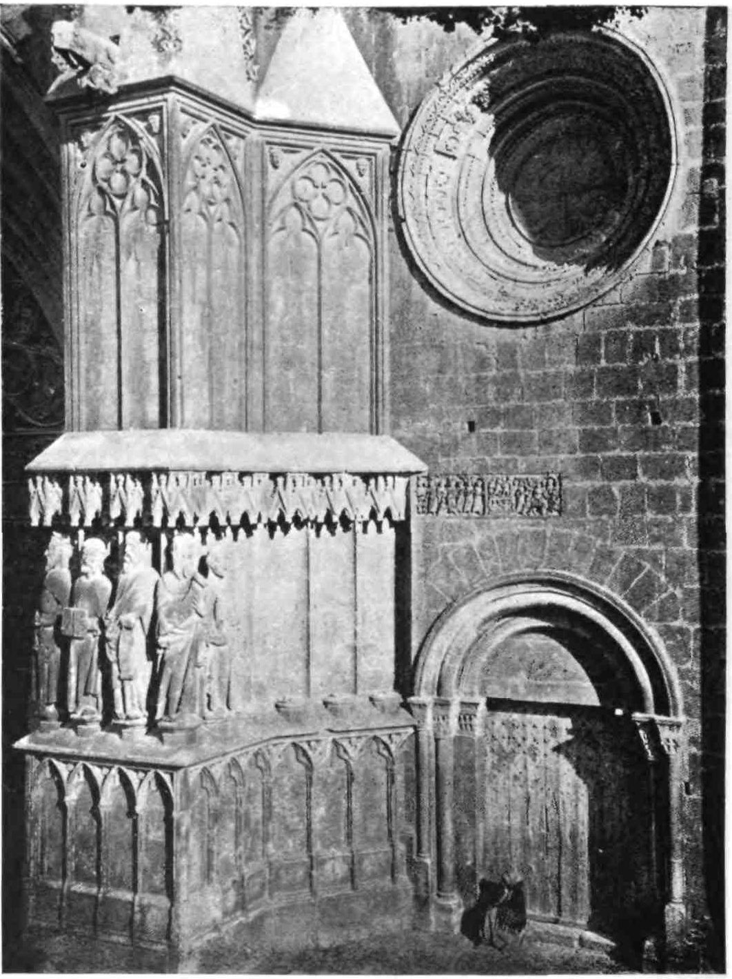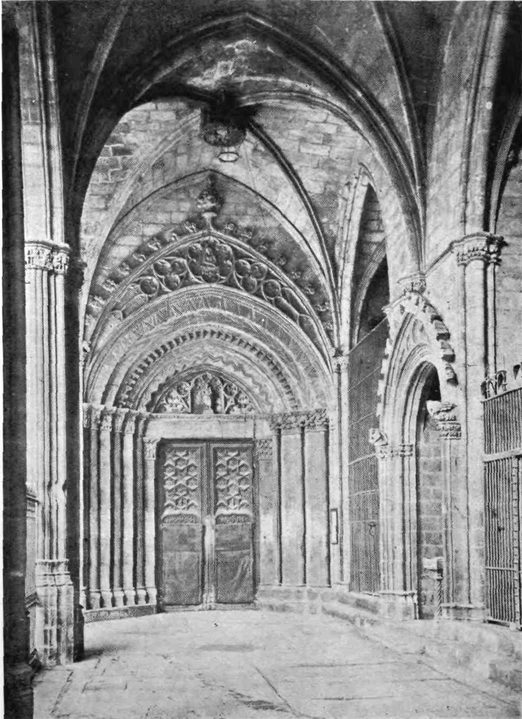 The transept doors are also very fine, especially the southern one. The cornice is beautifully sculptured and the wheel window above reveals in its details the influence of the Italian Romanesque. These entrances make us regret the effacement of the west porch, which is concealed by the vast square cloister covering that side of the church. This remarkable building, now occupied by troops, is the grandest, Street declared, he had ever seen. In its present desecrated state, it must be confessed it needs a highly trained eye to appreciate its beauty. The arcades are walled up, and there is some ground for supposing that when in ecclesiastical occupation the galleries were used as dormitory and refectory. The details vary greatly. The bays vary in width, the sculpture is of all sorts of design, and of all periods. Adjoining this vast cloister on the north side is a long barrel-vaulted hall, lighted only at one end. On{45} the west side the cloister is entered through an enormous western doorway with a pointed arch. South of this and almost detached from the cloister stands that beautiful octagonal steeple which served Pedro Balaguer as a model for the Micalet Tower at Valencia. It is 170 feet high and divided into five stages, “the whole construction being of the most dignified and solid description.”