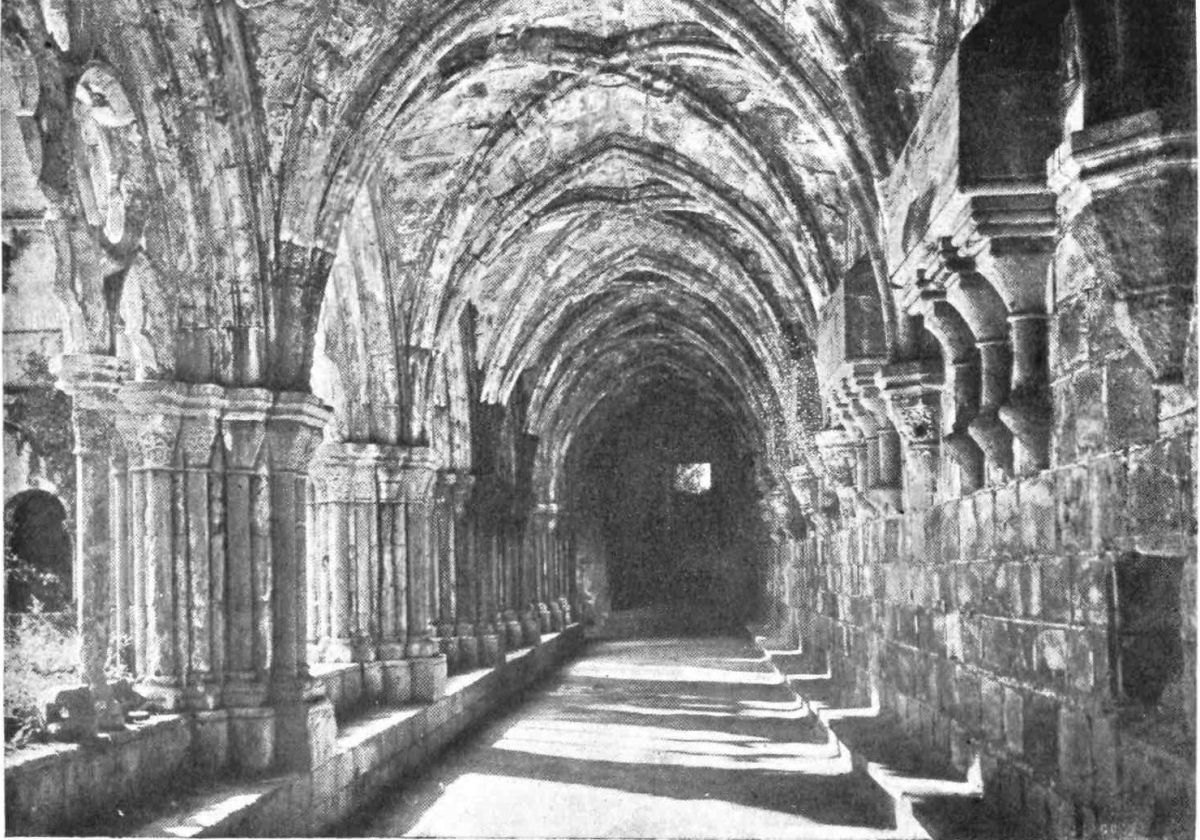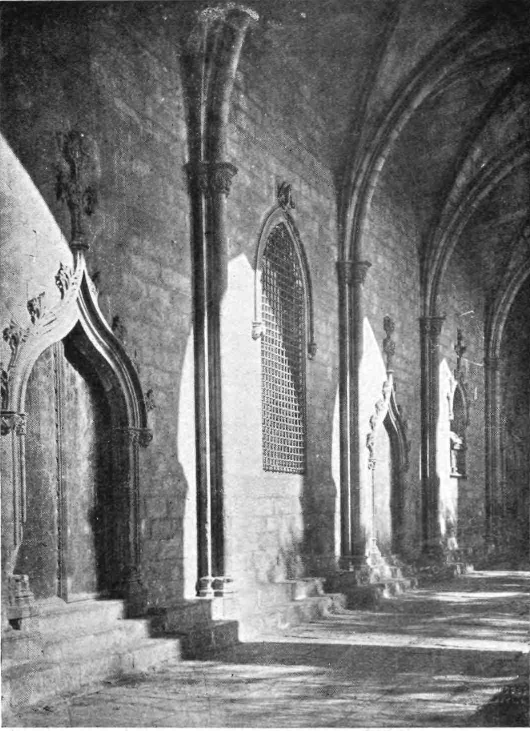 You may still traverse miles of cloister and hall at Poblet strewn with broken tablets, overgrown with shrubs and climbing plants. One of the most beautiful of the galleries is the Novices’ Dormitory, roofed in with timber; then there are the locutorium, the only spot where conversation was permitted between the recluses; the infirmary and the beautiful cloister of San Fernando, built in 1415 by order of the first king of that name, the little chapel of the saint, founded by the Count of Barcelona, and the royal apartments, built in 1375.{69}