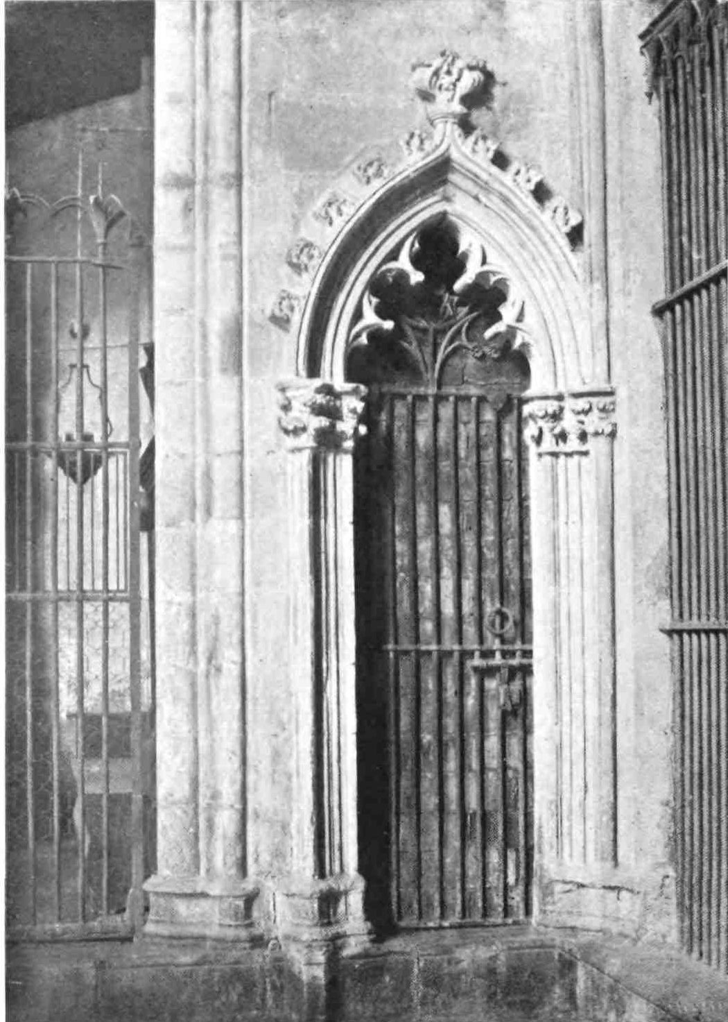 A floor runs round the church above the side chapels and is carried across the west front. The upper rooms were never used as places of worship. The chapels are closed by mediæval grilles of wrought iron. They date mostly from the sixteenth and seventeenth centuries, and present no very interesting features. This is fortunate for the painstaking sightseer, as the{13} obscurity renders an examination difficult. A crucifix in the uppermost chapel in the chevet is a memorial of the battle of Lepanto, where it was carried on the prow of Don Juan’s flagship. The image is believed by some to have bent its head to avoid the Turkish bullets. In the chapels of San Miguel Arcángel and Nuestra Señora del Patrocinio, close by, are the fine Gothic tombs of Bishop Berenguer de Palau (died 1240) and of one of his successors, Poncio de Gualba (died 1334). Leaving the ambulatory by the north, the chapel on the right contains another good Gothic monument to Bishop Escaler. The finest tomb, on the whole, is that of Doña Sancha de Cabrera, lady of Noalles, in the chapel of San Clemente, in the south aisle; and three chapels farther on is the sarcophagus of the great Catalan saint, Ramon de Penafort. The two wooden urns covered with crimson velvet in the wall between the south transept and the sacristy enshrine the ashes of Count Ramon Berenguer the Old, and his consort, Almodis (died 1070). Opening off the south aisle, close to the main entrance, is the large square chapel of the Holy Sacrament, or of St. Olegarius, with a fine star-vaulting, the seventeenth-century monument of the titular, and some paintings of Villadomat, a local artist of some repute, who lived in the first half of the eighteenth century. There are also some paint{14}ings of merit by the Tramullas, father and son, of Perpignan, but generally speaking this fine cathedral is poor in painting and statuary.