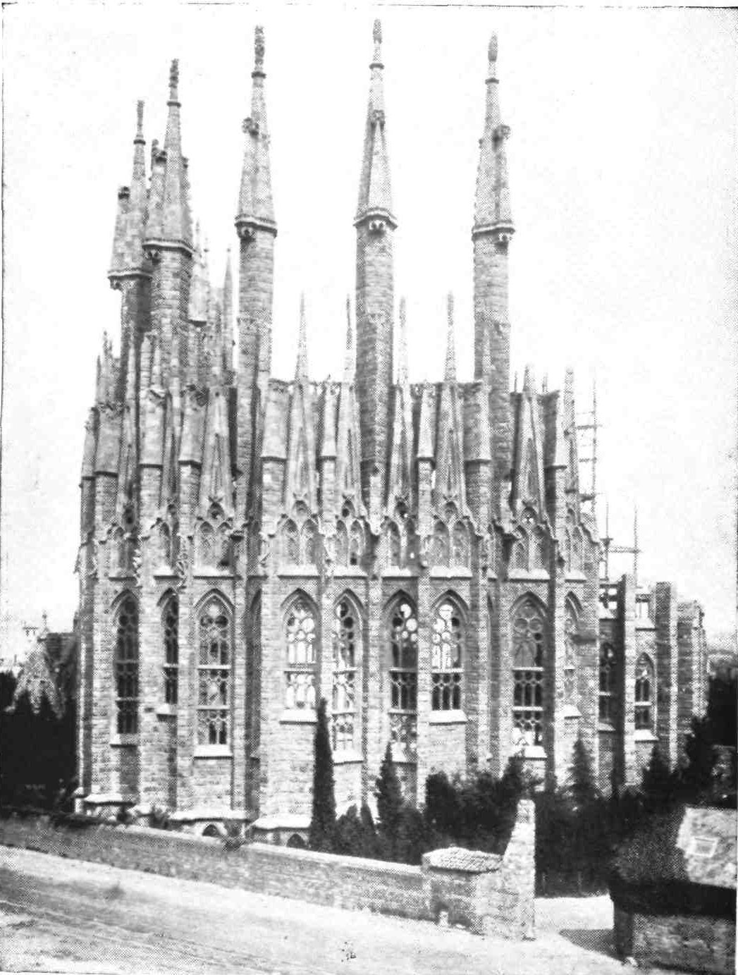 Standing on the sinister spot where, twelve years ago, twelve people were killed and fifty others injured by a miscreant’s bomb, we survey the fine west front. This is flanked by two octagonal towers, of the telescope kind, and has a magnificent rose-window, above which I rather felt that an attic or story gable was wanted. The portal is richly moulded, and adorned with sculpture. The doors are faced with iron.