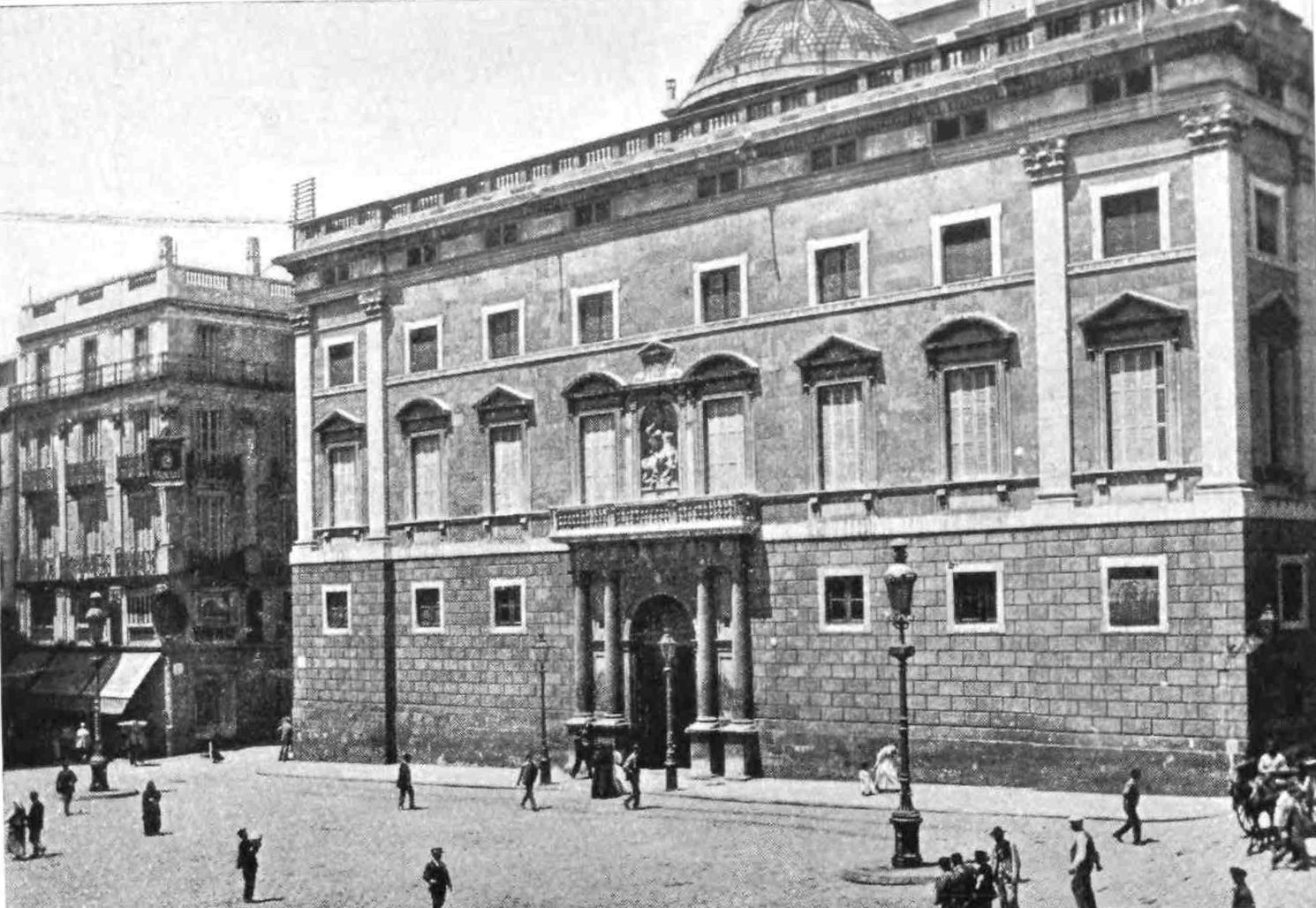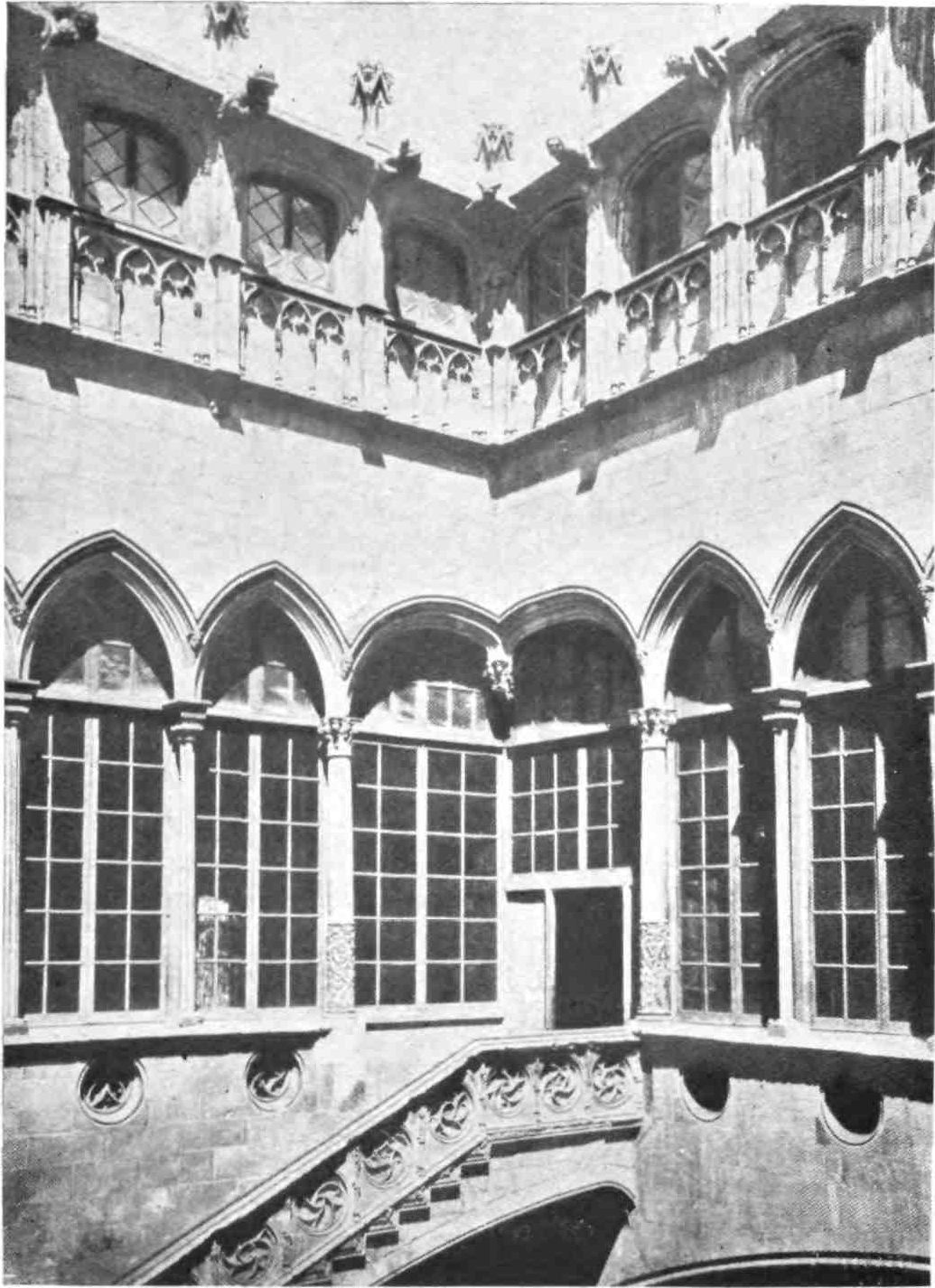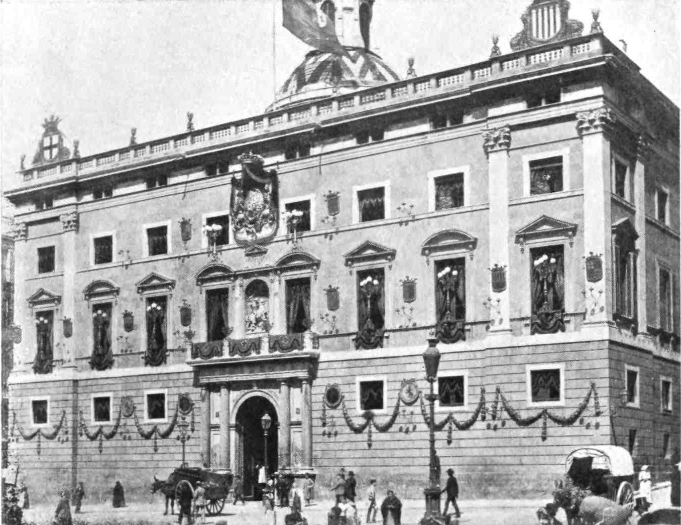 One instinctively searches at Barcelona for monuments of civic state befitting a city of such antiquity and dignity. Happily such are not lacking and have been preserved to us. The noble Gothic façade of the Town Hall (Casa Consistorial), erected in 1373, has been recently restored, fortunately with good taste. The Council Chamber (Salon de Ciento), formed of two bays which support an artesonado roof, is lined by a collection of portraits of Catalan worthies, among whom we distinguish Capmany, Villadomat and Montaner. A finer building and preserving more of its primitive character is the Diputacion, the old Parliament House of Catalonia, and now the seat of the Provincial Court. This monument, declares Piferrer, “is the admiration of foreigners and the honour of Barcelona. He who seeks for originality of style, let him examine all its parts and be convinced that many are of a character entirely new.” Built in the early fifteenth century, it underwent frequent restorations and enlargements, and was rebuilt in great part in 1609 by Maestre Pere Blai, who spared the best portions of the old work. The principal façade is cold and devoid of interest, except for the figure of St. George above{21} the entrance. To that saint is dedicated the chapel, with its fine ogival portal, and the adjoining wall damascened (to quote Piferrer) with reliefs. The chapel is the repository of an exquisite altar frontal, worked with the design of St. George and the Dragon, and designed by Antonio Sadarni, in 1458. The pillars sustaining the galleries of the patio, at one time much admired for their daring and ingenious execution, were bending and giving way under the strain till restored and strengthened a few years ago by Don Miguel Garriga y Roca, a local architect.