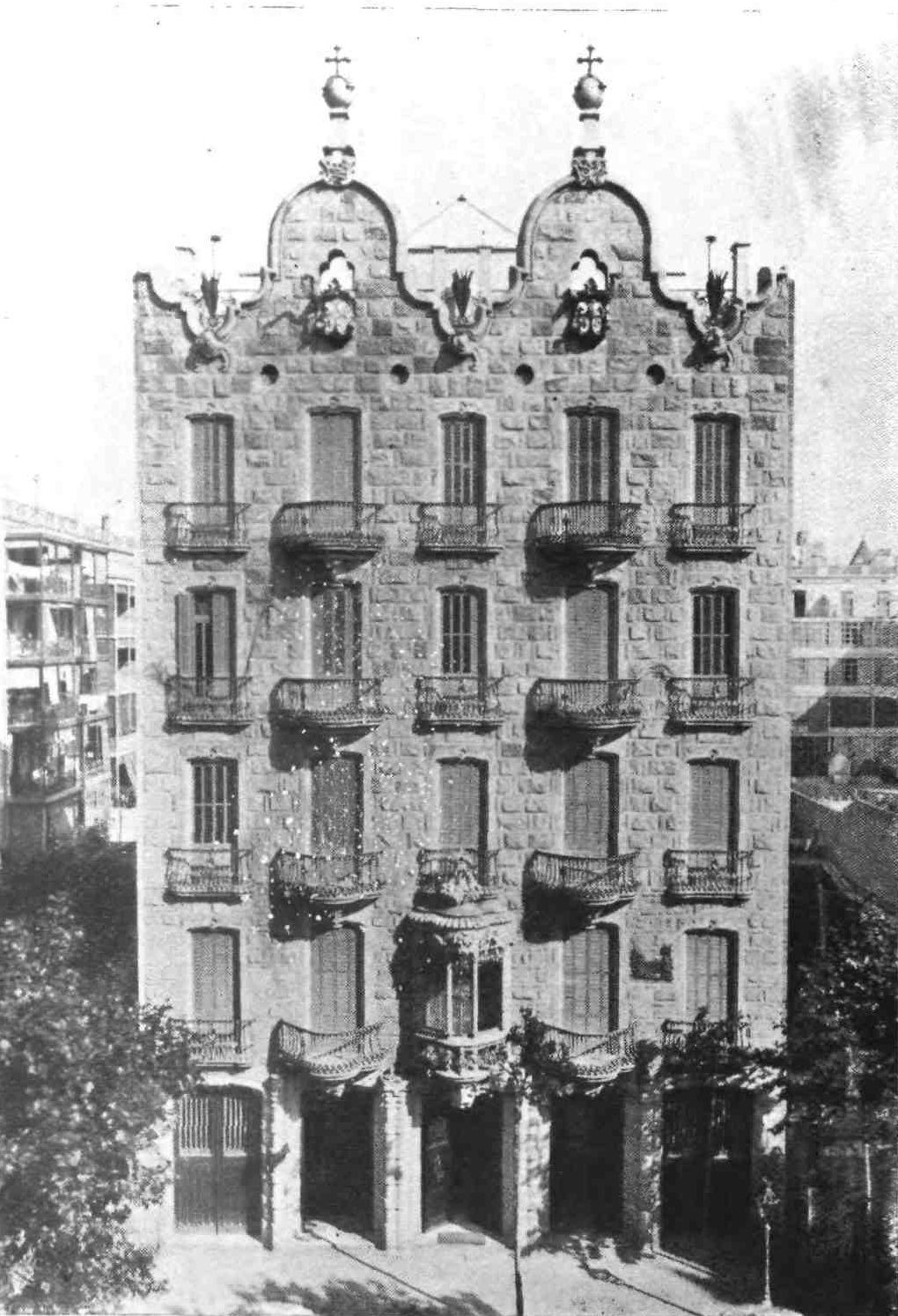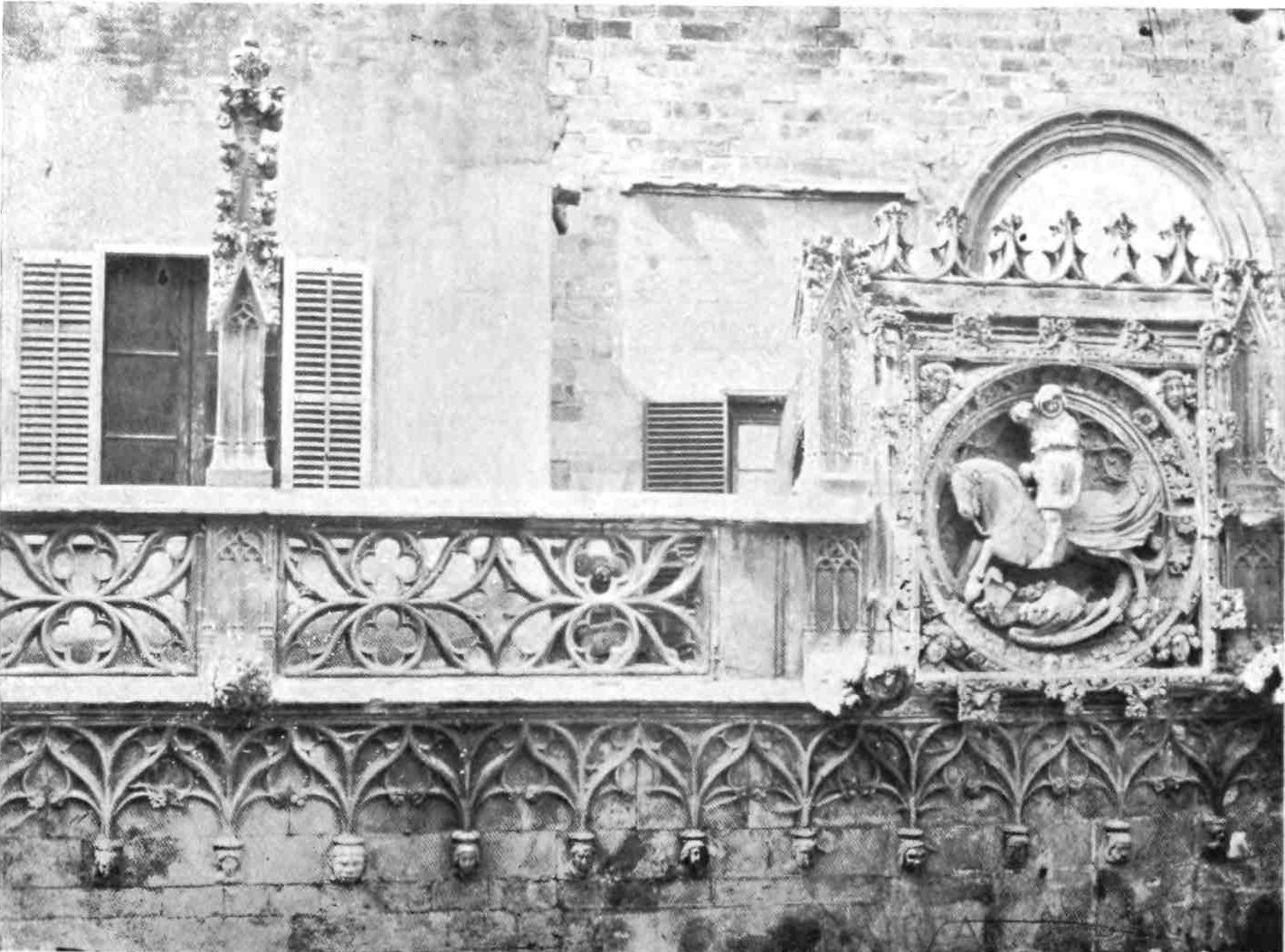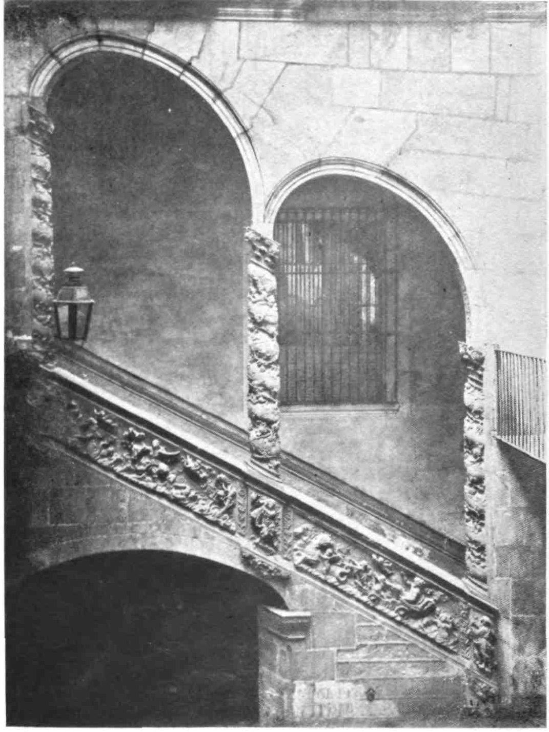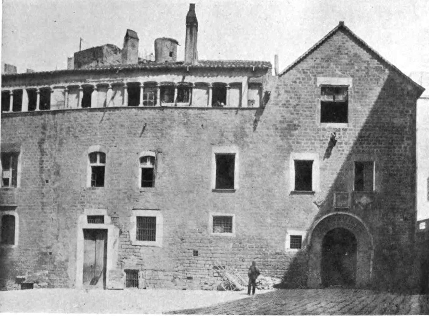 One instinctively searches at Barcelona for monuments of civic state befitting a city of such antiquity and dignity. Happily such are not lacking and have been preserved to us. The noble Gothic façade of the Town Hall (Casa Consistorial), erected in 1373, has been recently restored, fortunately with good taste. The Council Chamber (Salon de Ciento), formed of two bays which support an artesonado roof, is lined by a collection of portraits of Catalan worthies, among whom we distinguish Capmany, Villadomat and Montaner. A finer building and preserving more of its primitive character is the Diputacion, the old Parliament House of Catalonia, and now the seat of the Provincial Court. This monument, declares Piferrer, “is the admiration of foreigners and the honour of Barcelona. He who seeks for originality of style, let him examine all its parts and be convinced that many are of a character entirely new.” Built in the early fifteenth century, it underwent frequent restorations and enlargements, and was rebuilt in great part in 1609 by Maestre Pere Blai, who spared the best portions of the old work. The principal façade is cold and devoid of interest, except for the figure of St. George above{21} the entrance. To that saint is dedicated the chapel, with its fine ogival portal, and the adjoining wall damascened (to quote Piferrer) with reliefs. The chapel is the repository of an exquisite altar frontal, worked with the design of St. George and the Dragon, and designed by Antonio Sadarni, in 1458. The pillars sustaining the galleries of the patio, at one time much admired for their daring and ingenious execution, were bending and giving way under the strain till restored and strengthened a few years ago by Don Miguel Garriga y Roca, a local architect.