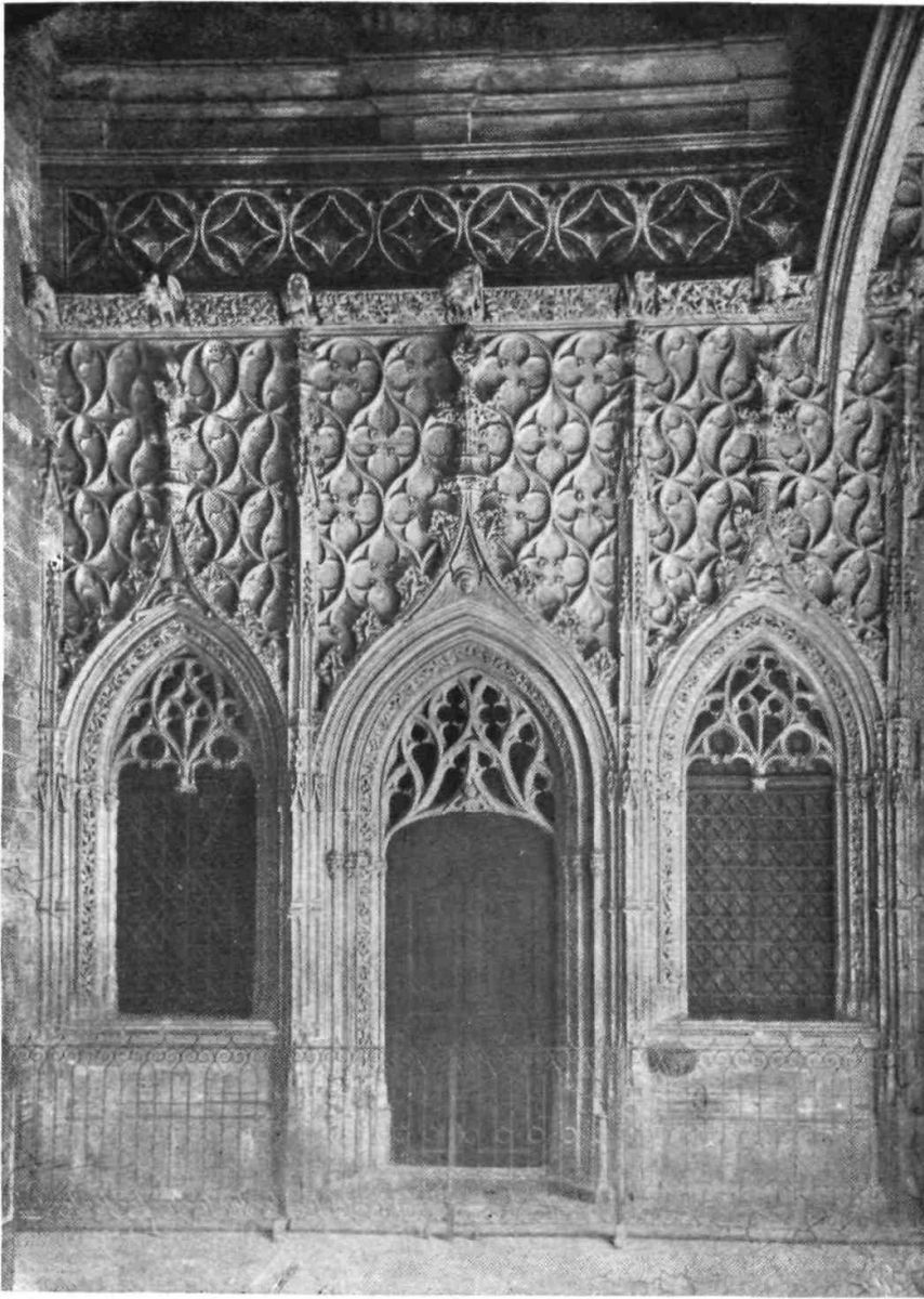 The chapter-house, the scene of many important councils, opens out of the south gallery of the cloister. The door is Norman. The exterior, like that of the cloister and cathedral generally, is most striking. The apse and the Tailors’ chapel are particularly fine seen from the outside.