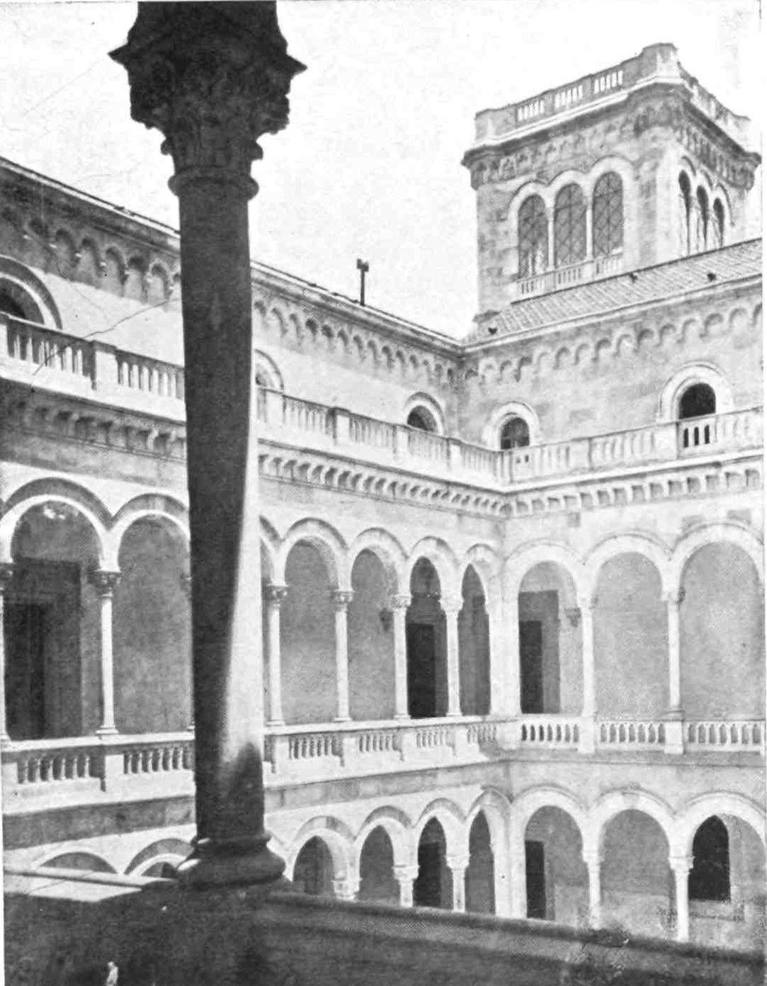 Hard by is the estate of Ben Dinat, so named, it is averred, because the conqueror expressed in those two words his satisfaction with a meal of bread and garlic served him at this spot. It is more probable that the name is that of some long-forgotten Moor. Then comes the little harbour and tower of Portopi and round the next promontory the lovely bay of Palma, with the capital of the Balearics smiling a welcome to the stranger. The walls that once surrounded the city have been demolished: the turrets that rise above the house-tops are those of the Cathedral and the Exchange (Lonja). We enter the town through the Water Gate, a building not without majesty, and crowned by a statue of the Blessed Virgin. The streets, as in most Spanish towns, are narrow and shady, often rewarding the curiosity of the passer-by with glimpses of Renaissance patios, graceful balconies, and turret windows. Among the most interesting houses of the Butifarras (big sausages), as the nobility of the island used to be called, are the Casa de Vivot and the palace of the Counts of Montenegro. But Palma is a living city, and side by side with these{91} dignified memories of the past we find handsome modern buildings such as the Bank of Spain and the Hall of Provincial Deputation. Nor does Palma want for wide breathing-spaces and promenades. It has the fine Paseo del Borne and the Boulevards constructed round the bay and on the site of the old fortifications. Close to the landing-stage the new-comer’s attention is first attracted by the Exchange or Lonja. Charles V. on visiting the island for the first time hastened at once to see it, eagerly demanding if it belonged to the Church or to the State, and was visibly relieved on hearing that it was a civil edifice. The Lonja is a quadrangular building, surmounted by a crenellated balustrade and flanked at each angle with an octagonal tower of six stages, one of these rising above the balustrade. The walls are strengthened with graceful pilasters, and pierced in their lower story by ogival windows with good traceries. The door is square and enclosed within an ogival arch. The interior forms a single great hall, the roof of which is supported by only four slender fluted columns, from which the arches spring like palm branches. This interesting building was designed and begun by Antonio Sagrera in the year 1426. Like the numerous other Spanish Lonjas, it has long been deserted by the mercantile community.
