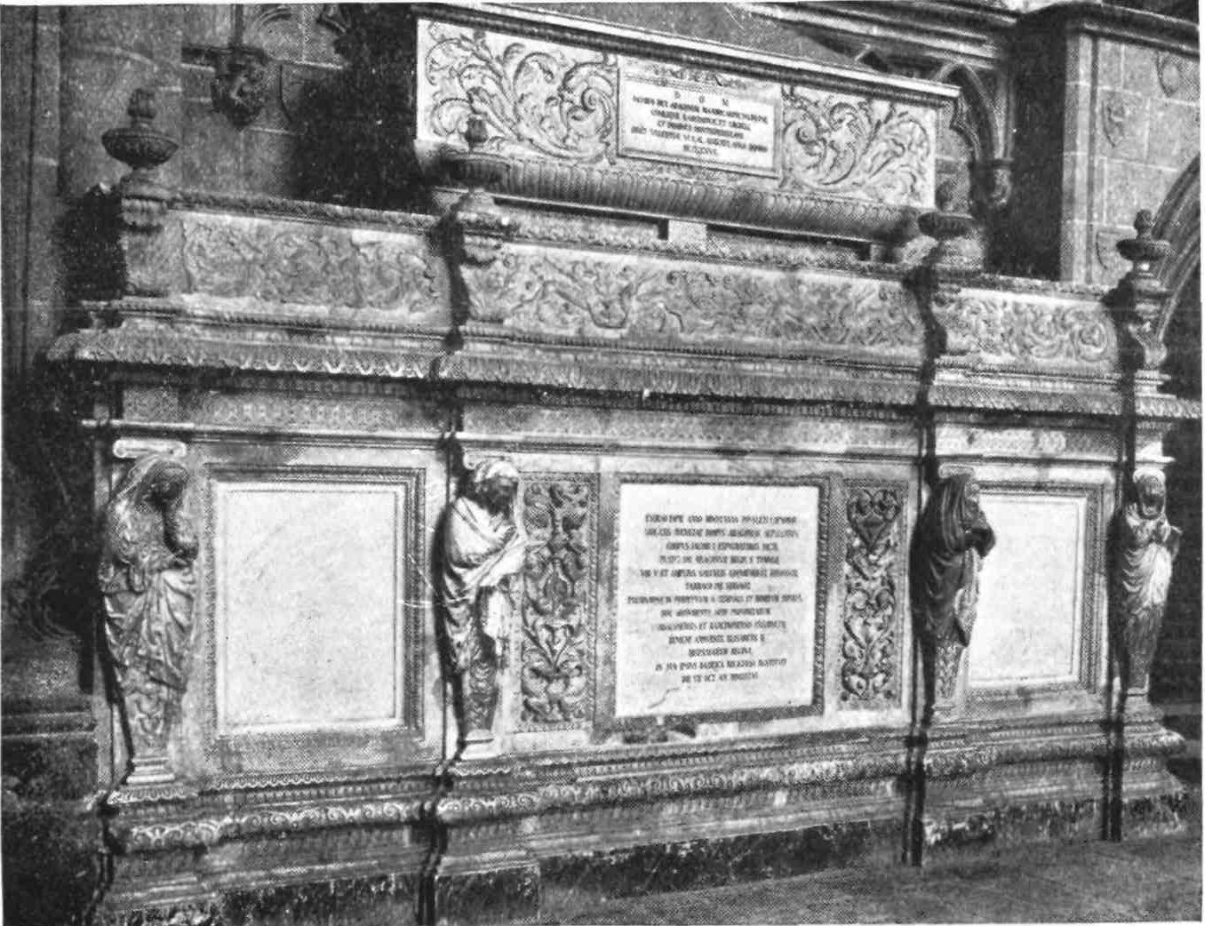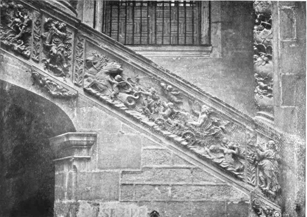 Returning from Lerida to Barcelona we pass the castle of Bellpuig, the seat of the great family of Anglesola—a massive fortress of red stone, restored in the sixteenth century. Its magnificent staircase still gives one some idea of the pomp and state of its former lords. The village extends from the castle to the church—a situation which inspired the erudite topographer of this country (Piferrer) with reflections that remind one of Don Quixote’s address to the goatherds. The church contains the tomb of Don Ramon de Cordova, one of the ablest lieutenants of Gonzalo de Cordova. His effigy, armed and holding his helmet, reclines in a sleeping posture on an urn adorned with reliefs of marine gods and monsters and upheld on the backs of sirens, whose hands are webbed; the sepulchral arch is formed by six Ionic columns, against which lean figures expressive of mourning; over the tomb is a relief of the Entombment. In niches on each side of{50} the arch are two life-size figures emblematic of Victory; above them, two figures leaning forth from medallions appear to extend laurels toward the hero. The plinth and cornice of this superb tomb are adorned with reliefs illustrating the victories and achievements of the deceased, who was as distinguished as an admiral as a general. His body remains in the urn practically incorrupt. The tomb is the work of Juan Nolano.