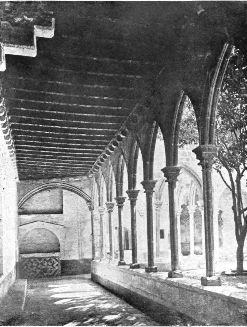The church communicates with a spacious cloister with four sides of seven bays, built at the beginning of the fourteenth century by order of Queen Blanca. The traceries of the windows remaining here and there are late Gothic, and contrast oddly with the severe lines and rude{71} capitals of the shafts. As at Poblet, in a corner of the cloister is a hexagonal chamber said to have been a lavatory. A great number of persons of distinction seem to have been buried in this cloister, in attendance, one might say, upon their lords within the church. Among these was the knight Queralt, who may been seen in effigy in a suit of fine mail, with surcoat and greaves and girt with two-handed sword. Some of the figures of divine persons to be seen over the tombs were evidently carved by late fourteenth-century sculptors.