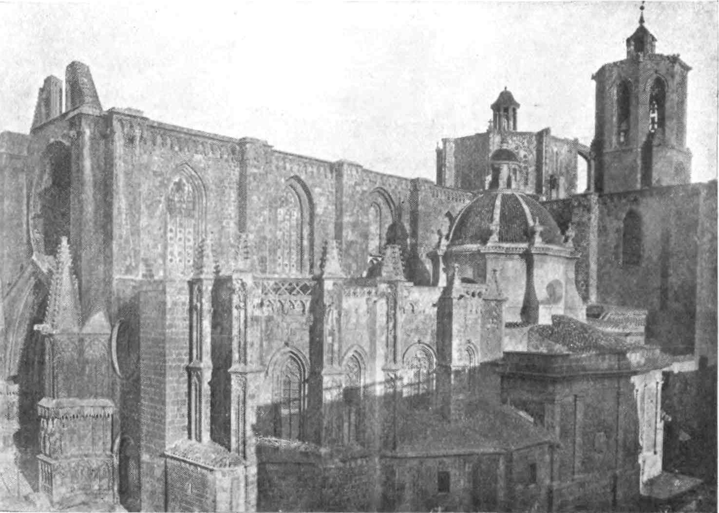 The primitive Cathedral was built by Count Ramón Berenguer between 1046 and 1058, and{10} considerably enlarged in the year 1173. The building, not yet satisfying the needs of the thriving city, was entirely rebuilt at the beginning of the fourteenth century. The design is attributed by Street to Jaime Fabre, a native of Majorca, who was succeeded as master of the works in 1388 by Master Roque. The last stone of the vault was placed on September 26, 1448.