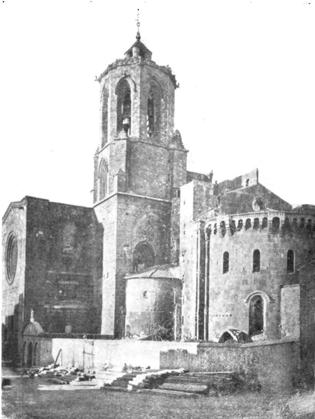 The oldest church at Gerona appears to be the little oratory of San Nicolas, built in the form of a cross with its arms ending in apses, surmounted by domes. The height of the nave is not much more than that of a tall man. Hardly inferior in antiquity is the church of San Pedro de Galligans.{31} This is named, not after the Gauls, as one might be tempted to suppose, but after a little stream called the Galligans, which at this point flows into the Oñar. Like every other religious edifice in Gerona, its foundation is attributed to Charlemagne, but (according to Piferrer) the earliest mention of the church occurs in the year 992, while the actual fabric was building at the time a third part of the coinage of Gerona was given by Count Ramon Berenguer III. to the Benedictine monastery of which his brother was abbot. Street inclines to think San Pedro was built by the architect of the church at Elne in Roussillon. The principal apse here, as at Avila, projects beyond the town wall; on the south side of it are two smaller apses side by side, opening into the south transept; the north transept expands into apses on the north and east and is crowned by a fine octagonal steeple with two rows of round-headed windows. The west front is approached by steps, many of them bearing Romano-Gothic inscriptions; there is a single round-arched western door with good fern-leaf carving on its capitals, and above this a rose-window. Within, the church consists of a nave, separated by tall, massive columns from the aisles. The capitals are rude, but offer great variety of design and execution. There is a clerestory, but no windows to the aisles, which{32} are more like corridors. On the south side is a cloister probably carved coeval with the church, but terribly damaged during the siege, and now converted into the Provincial Museum.