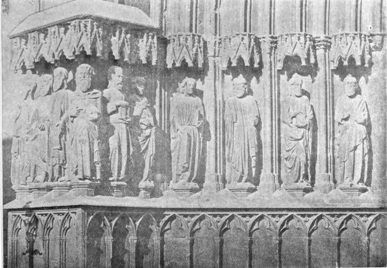 The west front is striking; it was begun in 1278, but not completed for another hundred years. The lower half is occupied by a deep-set portal of four orders, rising to a point. The jambs are occupied by figures of saints under canopies, and these are continued round the two buttresses which flank the doorway and end in pinnacles. The shaft is formed by a statue of the Madonna upon a pedestal, the sides of which exhibit in relief the scenes of the Creation and Fall. “These subjects are very fitly placed here, the Fall in the centre coming just under the feet of her who bears Our Lord in her arms, and thus restores the balance to the world.” (Street.) The tympanum is pierced with rich geometrical tracery. Over and behind the cross surmounting this grand doorway is an enormous rose-window. The whole is surmounted by a gable, the central portion of which has disappeared, giving a somewhat ruinous appearance to the church when seen from a distance. Flanking this, the front of the nave, are the round-arched entrances to the aisles, with round windows above, betraying{55} Norman influence. Ford states that the great rose-window is Norman work.