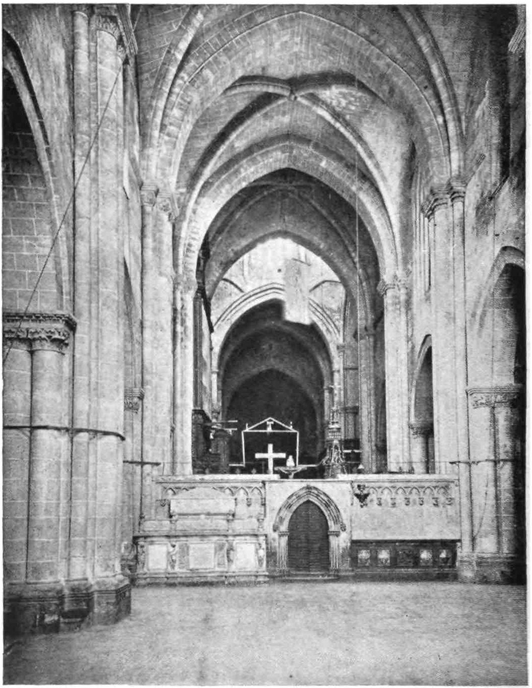 The interior of the church was restored as lately as twenty years ago. All styles seem to have entered into its architecture. Instead of columns, massive piers support the vaulting, and mark off the aisles from the nave. The chancel—merely a shallow apsidal prolongation of the nave—is strewn with the ruins of the high altar and the roof.