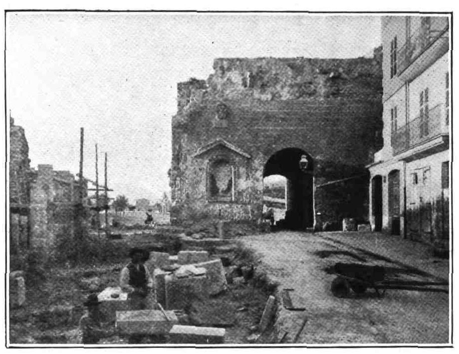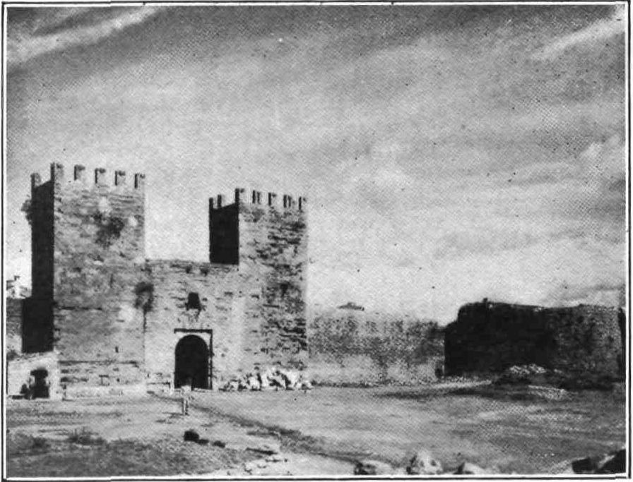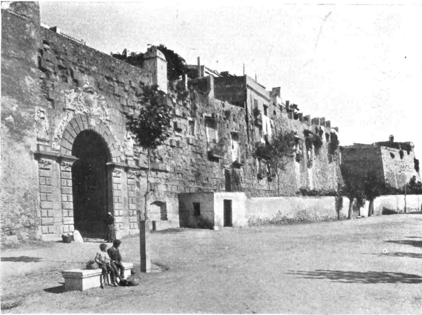These edifices apart, the Middle Ages have done little for Tarraco togata. Its remaining monuments belong to its infancy and prime. The Cyclopean walls, now declared a national monument, extend from near the Puerta del Rosario to the crest of the hill on which the city stands, and thence to the eastern angle of the ancient prætorium, now converted into a prison. The base of this wall is formed by huge blocks of unhewn stones, uncemented, and with their interstices filled by smaller stones. The character of the work bespeaks the primitive nature of the builders. On this rude foundation rests the more regular work of the Roman conquerors. The enceinte formed by these walls is of the shape of an irregular polygon, measuring three-quarters of a mile across, and open on one side. The angles are defended by square towers, and the curtains are pierced by gates, to some of which the name “Puerta ciclopea” is given. The{60} Puerta del Rosario, called in the Middle Ages “Portal de Predicadors,” is about eight yards thick and is roofed by an enormous block of stone about 36,000 kilogrammes in weight. On the stones composing the Roman part of the wall, Iberian letters are traced. These were merely masons’ marks for the guidance of the native workmen, and form no words. The Torre del Arzobispo was raised in Christian times on the old Roman tower. The wall extending to the Torre del Capiscol is attributed to the Scipios, and dates in any case from their time. The principal Roman gate, called the Puerta del Socarro, is a noble work formed by three concentric arches. Passing through this we obtain a fine view of the strip of wall built by order of Hadrian, and may re-enter the city by the eighteenth-century gate of San Antonio, which pierced a wall built or restored by Norman adventurers in the twelfth century.