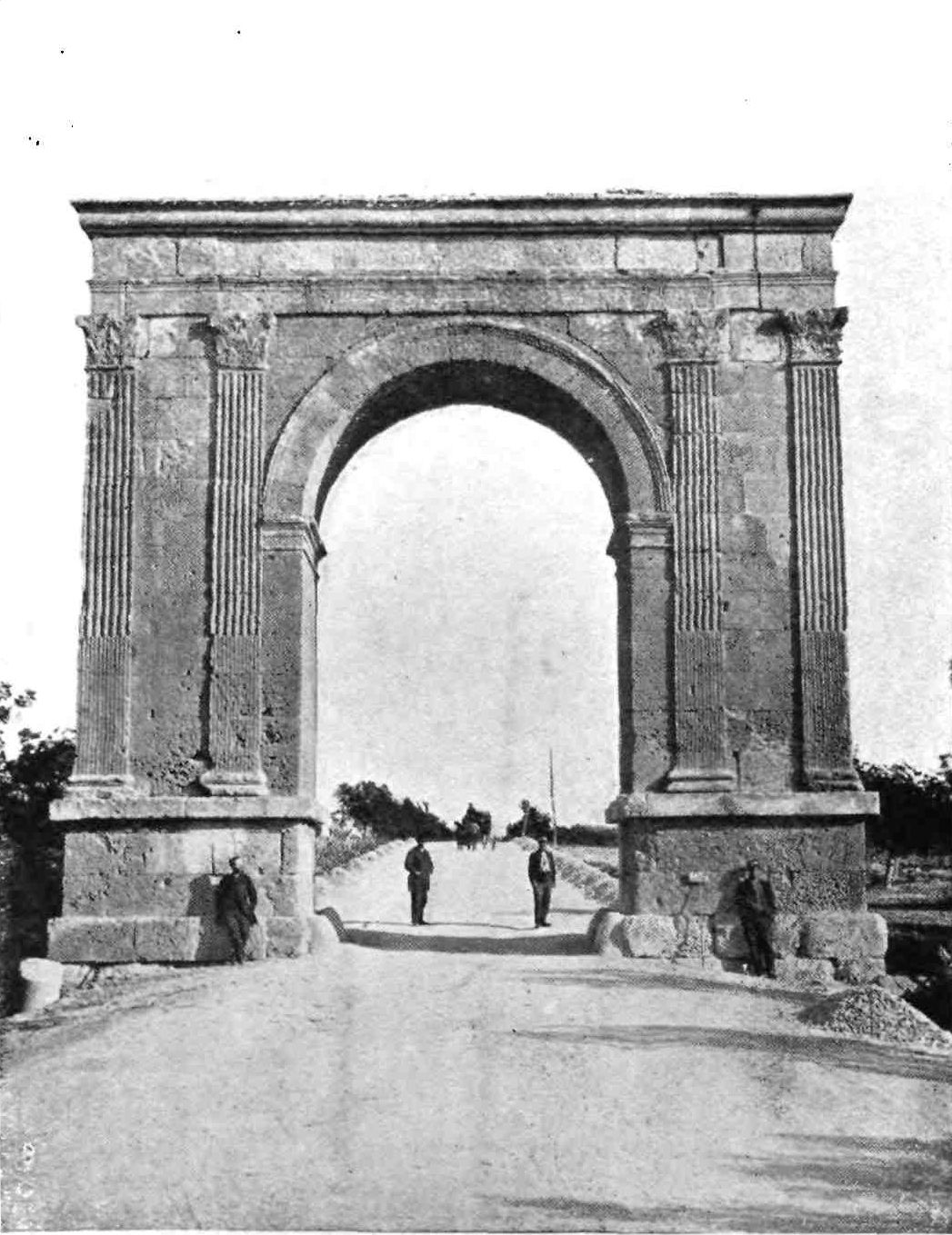 Within the city itself not much remains from Roman times. The sites of the forum, the prætorium, and the great temples may be traced easily enough, and stones hewn by Roman hands and commemorating often enough Roman dead, are embedded in the walls of houses and churches all over the town. The local museum contains a few of the spoils of antiquity. There is a beautiful statue of Dionysus in Parian marble,{61} and a great variety of votive inscriptions. For more substantial memorials of the Roman era we must leave the city and follow the Barcelona road some four or five miles. Here we reach the celebrated monument known as the Tomb of the Scipios, consisting of a rectangular base and an upper body, on one face of which are sculptured in high relief the figures of two warriors. The cornice is engraved with a legend in which the words “perpetuo remane” are alone decipherable. There is no ground whatever for supposing that the figures represent the brothers Scipio or that this monument marks their resting-place. It is more probably the sepulchre of some wealthy Roman settler.