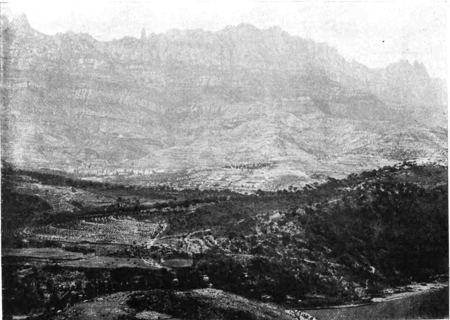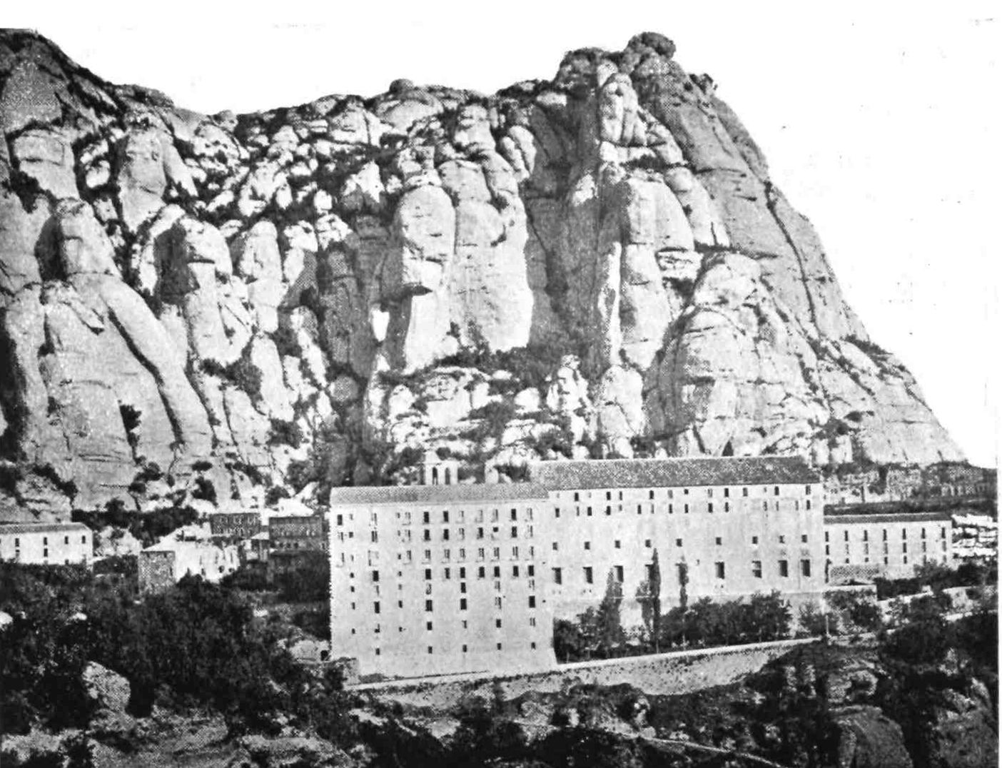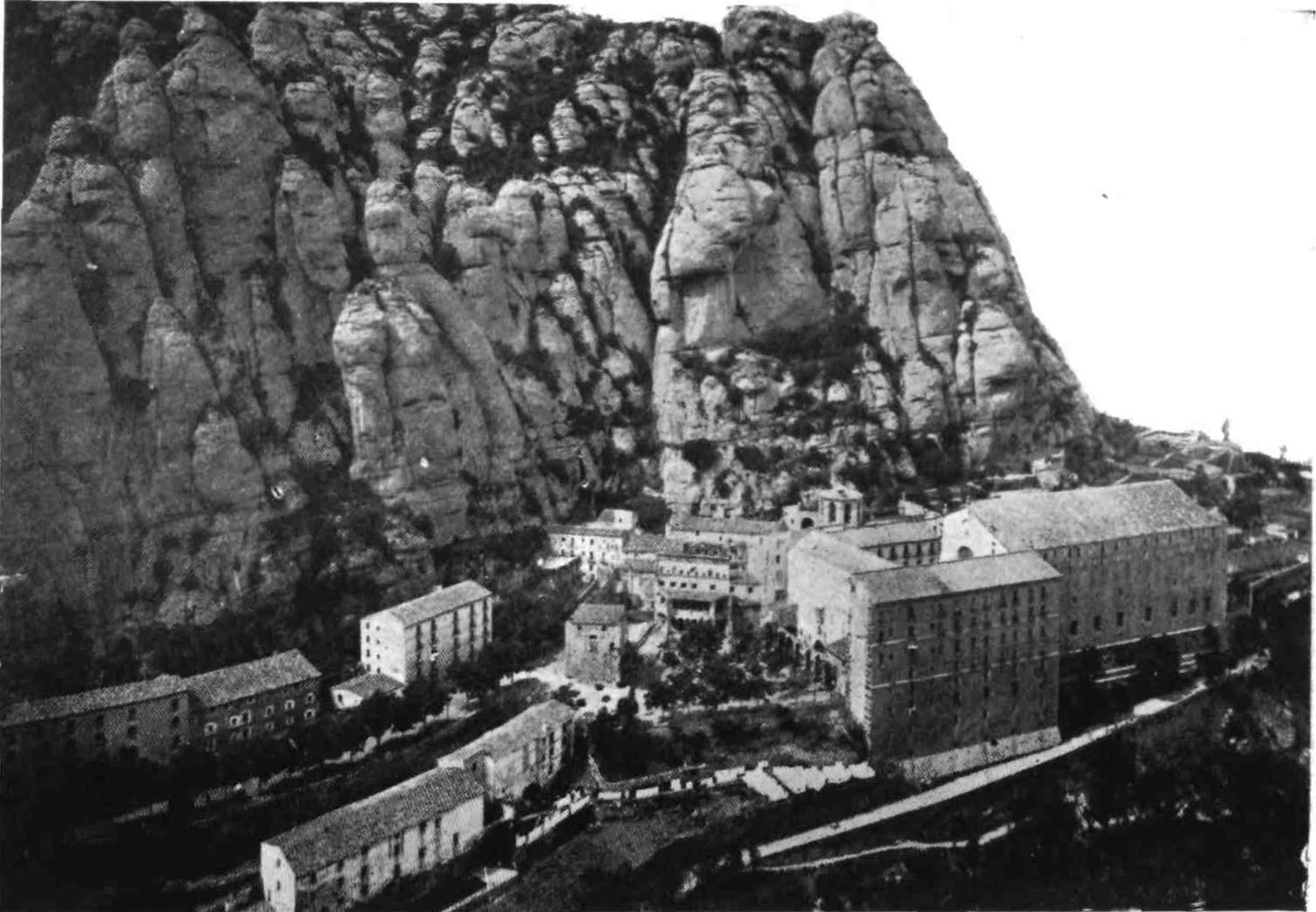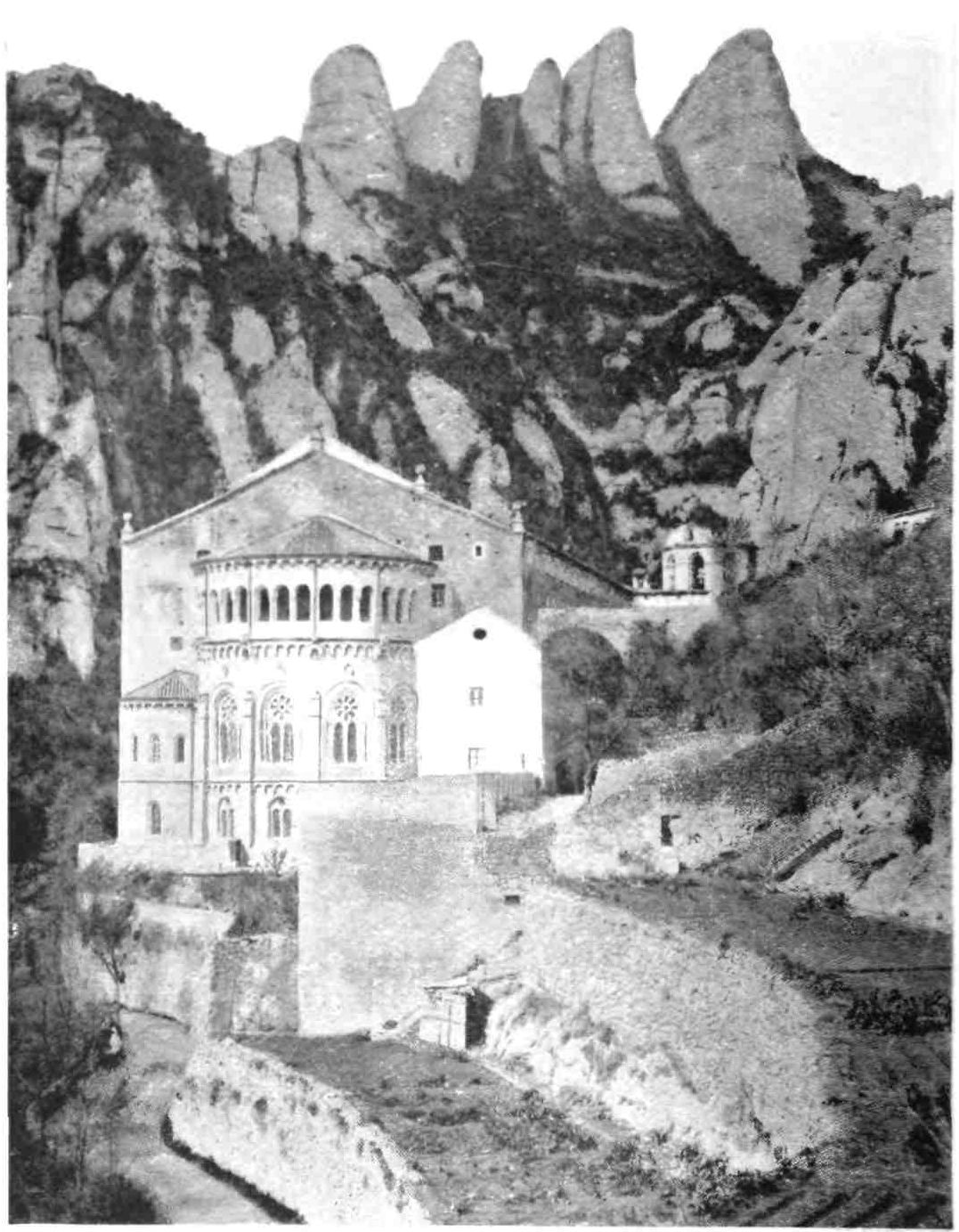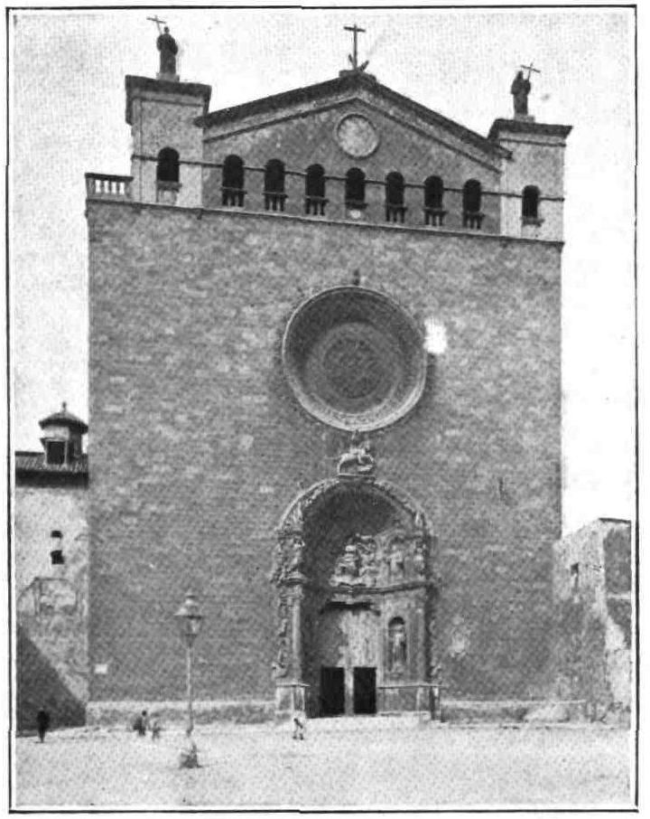 We may trace the footprints of St. Ignatius to Manresa, a name dear to the Jesuit in all lands, and borne by the Manchester of Cataluña. It is a lively, picturesque town, built on an amphitheatre of hills on the left bank of the Cardoner. High over the factories towers the Collegiate Church begun in 1328 and finished, probably, a hundred years later. It is one of those wide-naved churches characteristic of the principality, its span of nave is, in fact, greater than{79} that of any cathedral with aisles, except Palma. An interesting peculiarity is the flying buttresses built partly in and partly outside the church. Over the first roof rises an impressive bell tower. The interior is disappointing. The side chapels are Gothic. There is some good glass in the clerestory windows, and the organ displays one of those Saracens’ heads we so often find in Catalan churches. In the archives are some interesting pictures by local artists, reminding one of Byzantine work, and there also is preserved that altar frontal which excited the fervent admiration of Street. In a vault beneath the presbytery are treasured the relics of St. Agnes and St. Maurice, translated here from Vienne on the Rhône in the time of Berenguer III.