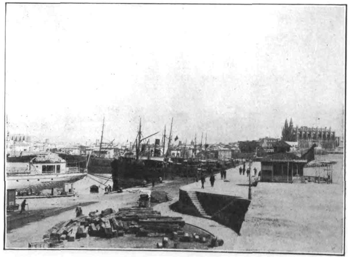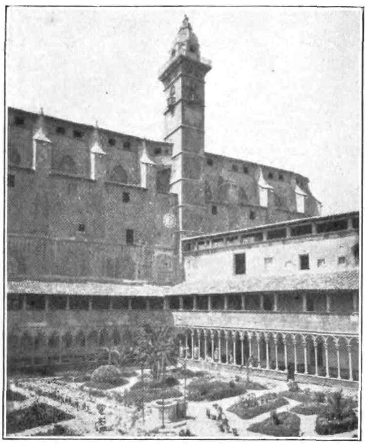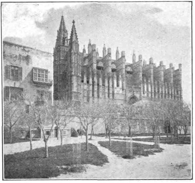The cathedral towers above the whole city and{92} is one of the most important churches in the kingdom. The name of the architect is unknown, but the foundations were laid by order of Jaime the Conqueror soon after he had annexed the island. The plan is rectangular, the walls supported by massive flying buttresses, surmounted with pinnacles and turrets. The south front is the finest and is pierced by the beautiful Puerta del Mirador, in florid Gothic style, the work of Pedro Morey, who died in 1394. The west porch is an elaborate work, finished in 1601. On the north side is the noble square bell-tower.
