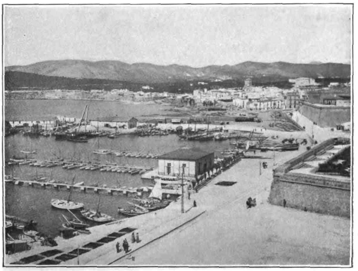 Ibiza, the third largest island of the group, is one of those spots which can afford no sort of justification for its existence. It is a mere backwater, a stagnant pool of humanity, interesting, though, as a place buried beneath prejudices and customs hundreds of years old. How should they be blown away in so out-of-the-way an island? The town stands on a fine harbour and reminds one rather of Guernsey. The collegiate church, formerly a cathedral, was founded by the Archbishop of Tarragona, in the thirteenth century, at the time the island was granted to him by{105} Jaime the Conqueror. It is uninteresting, except for the view from the belfry. Better worth a visit is the fortified church of San Antonio at the other end of the island, wherein the people took refuge at the approach of the Corsairs. It is flanked with two massive towers and the apse has a parapet pierced with embrasures for guns. The walls are nearly eight feet thick, and the doorway is protected by a machicolation.