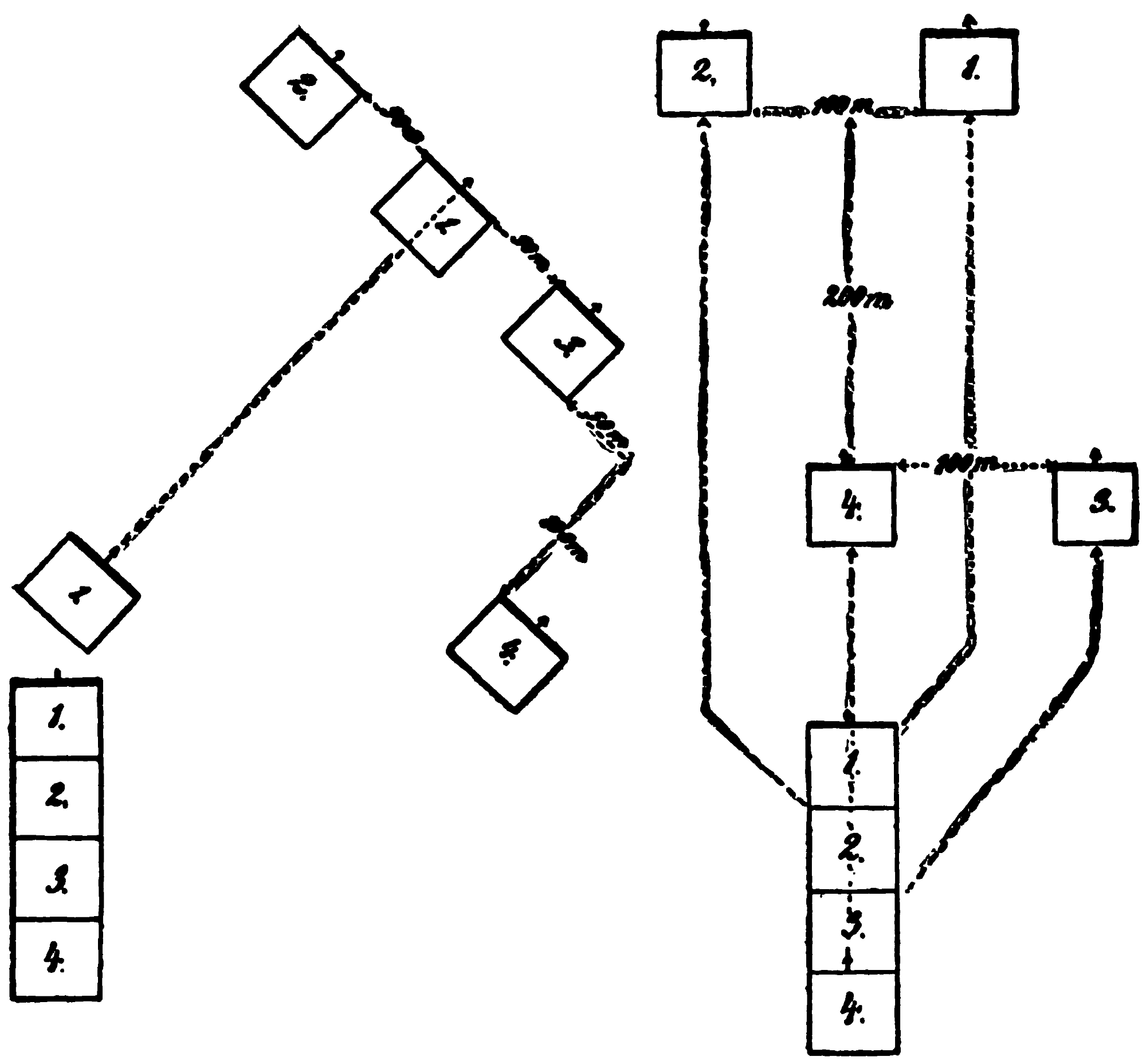 Two infantry ammunition columns of the 1st echelon, which, as a rule, constitutes the “ammunition supply center” at the commencement of an action, march at the head of the combat train (train de combat). A half-filled infantry ammunition column must at all times be available at this “ammunition supply center.” Ammunition wagons of the infantry ammunition column are sent forward at the request of the division commander to the position taken up by the company ammunition wagons. The latter are generally posted not more than 1,000 m. in the rear of the fighting line, and parts of each infantry ammunition column (usually one ammunition[482] wagon for each battalion) are posted by an officer not more than 1,500 m. in rear of these. The empty company ammunition wagons are not refilled, the ammunition being sent forward directly from the ammunition columns. As soon as the infantry ammunition columns are informed which organizations they are to supply, they send out non-commissioned officers to locate the ammunition wagons of those organizations and establish communication with them. The commander of the ammunition column directs where empty ammunition wagons are to assemble. In emergencies, wagons of the infantry ammunition column may also drive close up to the fighting line. In this case, empty wagons assemble near the groups of company ammunition wagons, and from there they are sent back in trains to the ammunition column to which they belong.