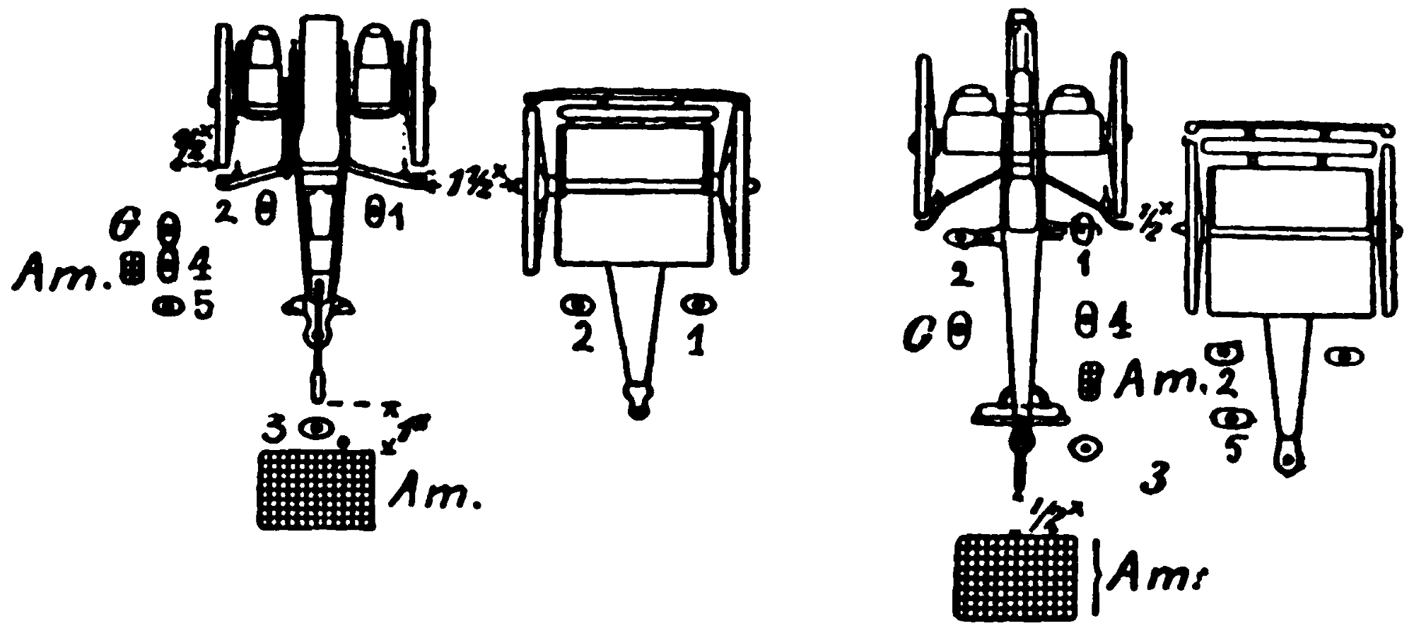 [517] The company ammunition wagon carries 9,450 rounds of ammunition, packed in seven compartments. It consists of a body and a limber, has a width of track of 1.13 m., and is supplied with eight sacks which serve to carry ammunition to the troops. During the day its position is indicated by a red flag, and at night by a green lantern.
