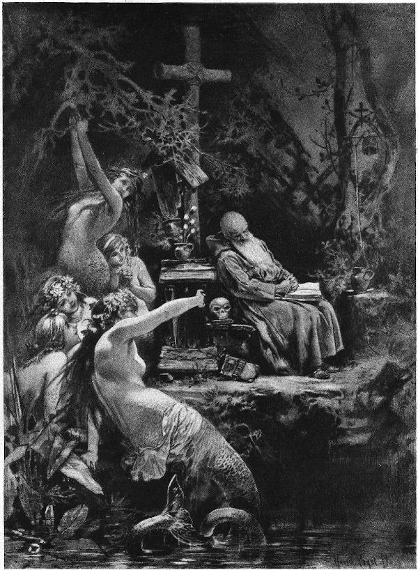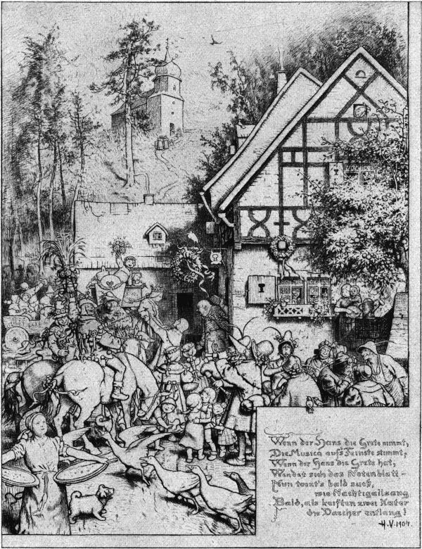 Dann erst wird uns Hermann Vogels künstlerische Bedeutung und Stellung noch viel eindrucksvoller zum Bewußtsein kommen, namentlich sein inneres Verhältnis zu Moritz v. Schwind und Ludwig Richter, seinen beiden »Kunstheiligen«, denen er auf dem Titelblatt seines Bilder- und Geschichtenbuches (vgl. Kunstwart-Heft vom April 1921), in gestaltenreichen Gedenkblättern und zahlreichen Märchenbildern gemütinnige Ehrenmale geschaffen hat. Bemerkenswerte Kunstbekenntnisse Hermann Vogels enthält auch ein Bild, auf dem er in die Rinde des Eichbaums deutscher Kunst, der von modernen Stürmern gefällt werden soll, folgende Namen eingeschrieben hat: Dürer, Holbein, Cornelius, Rethel, Moritz v. Schwind, Spitzweg und Ludwig Richter. Ferner sein Spruch, in dem er seinen Meister Schwind zur Deutschen Kunst sagen läßt: