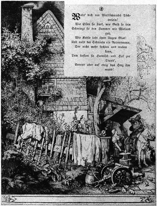 Als begeisterte Anhänger und Vorkämpfer des Heimatschutzgedankens sind wir dem Künstler aber noch besonders dankbar, daß er bemerkenswerten Resten und Zeugen heimatlicher Bauweise so liebevoll nachgegangen ist und diese uns in vielen seiner Bilder erhalten hat: die schindelgedeckten Bauernhütten des Vogtlandes mit dem Rundbogenbalken über den kleinen Wohnfenstern, den kunstvoll mit Schiefer verkleideten Giebel der Waldschmiede in Heinersgrün, den altmeisterlichen Holzwerkgiebel ebendort (in dem Bild von der »Hochzeitsmusik«), das echt vogtländische Bauernhaus mit Holzgalerie (in Grimms Märchen von den klugen Leuten), das heimatliche Bauerngehöfte mit Taubenschlag und Bienenstöcken und Kleinod- (»Klaanet«) Garten (beim Märchen vom Frieder und Katerlieschen), die altvogtländische Bauernstube mit Spinnrad, vogtländischem Hauskalender und Kachelofen und volkskunsthandwerklicher Holzverkleidung (aus den Waldmappenbildern), den urwüchsigen Dorfbrunnen mit bretternem Brunnenhaus und wuchtigem Klotzhebel, im Volksmund »Leerl« genannt, (beim Märchen vom Fundevogel), den Wiedersberger Gasthof mit seinem Fachwerk und kunstschmiedeeisernem Wirtshausschild (im Märchen von dem, der das Fürchten lernen wollte) und endlich, nicht zuletzt, auch die weltabgeschiedenen Mühlen alle in den Waldbachtälern des Vogtlandes, vor allen die Kienmühle im Kemnitzgrund nahe dem Burgstein, zwischen Ruderitz und Geilsdorf, des Künstlers Lieblingsmühle, wo er so gern geweilt, die er in einem seiner schönsten Gedichte also preist: