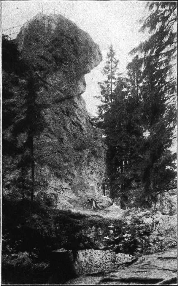 Die große Ausdehnung des Schönecker Höhengebietes erklärt sich übrigens daraus, daß hier mehrere Gebirgszüge zusammenstoßen: das Elstergebirge, das sich von hier aus nach Südwesten hinzieht, und von der Kirchberger Seite her der westlichste Ausläufer des Erzgebirges, der vom Kuhberge bei Schönheide beginnt und wegen seiner Höhe bis zu siebenhundert Metern eine Reihe von Genesungsstätten enthält, die, von ausgedehntem Hochwald umgeben, von ihrer luftigen Höhe aus freundlich in das gewerbfleißige Tal der oberen Göltzsch herabschauen. Auch der etwas südlich davon verlaufende vogtländische Kamm des Erzgebirges, der sich etwa vom Kranichsee bis zum Schönecker Wald dahinzieht, ist anziehend genug,[222] um mit dem übrigen Teile dieses Gebirges einen Vergleich aushalten zu können. Um den hohen Wall, der sich hier zwischen das sächsische Niederland und das Egertal schiebt, durchwandern zu können, verläßt man am besten bei Rautenkranz, das bereits dem Vogtlande angehört, die Bahn des romantischen oberen Muldentals, die von Aue ab stundenlang zwischen Felstürmen und Wiesentälern bis zur Höhe des Schönecker Waldes hinauf dahinführt und wandert auf der wohlgebauten Straße in dem Tal der großen Pyra aufwärts, die in den Mooren des Kranichsees entspringt. Noch zwei Dörfer mit den charakteristischen erzgebirgischen Holzhäusern haben hier Platz gefunden, bis nach etwa zwei Wegstunden auch die letzten menschlichen Siedlungen aufhören und ein einsames Waldtal die Blicke des Wanderers bannt: bis fast an die drei oder vier Häuser von Sachsengrund ziehen sich von den Höhen die Fichten herab, und eintönig plätschern die Wässer im Wiesengrund, während nach der böhmischen Grenze zu der fast tausend Meter hohe Rammelsberg die Wacht hält. Was noch jenseits dieser Häuser liegt, gehört bereits der Waldwildnis an, in der sich der Weg noch eine Stunde lang hinaufzieht, bis der Kranichsee mit seinem Hochmoor sich weit über die Höhe von fast neunhundert Meter ausbreitet. Hier beginnt auch der sogenannte Schwertweg, der über den Rücken des kleinen Rammelsberges nach dem Vogtlande hinführt. Eine merkwürdige Höhenstraße, von der sich der Blick rasch nach allen Seiten weitet: im Norden die blauen Linien der Auerbacher Berge mit ihrem Waldreichtum, und nach Süden zu der Steilabfall des Gebirges nach der Egerebene, hinter der weitere Gebirgszüge Nordböhmens hervorschauen. Bei einer Waldlichtung überschreitet hier die Landstraße die Gebirgshöhe, die von Tannenbergstal nach Klingental hinüberführt. Aber wir wollen das merkwürdige Gebilde des Schneckensteins nicht vergessen, das sich bescheiden im Walde versteckt hält und der schwer zu finden wäre, wenn ihn nicht die Markierung des Verbandes vogtländischer Gebirgsvereine jedem bequem zugänglich machte. Von den Topasen ist allerdings gegenwärtig ebensowenig mehr zu sehen, als von den kleinen Schnecken, nach denen dieser einsam im Walde emporragende Fels seinen Namen hat. Auf Treppenstufen ist sein Gipfel auch für Ungeübte zu erklimmen, und man könnte, wenn man die Felsrisse und Felsblöcke vor sich hat, einen Augenblick an irgend einen Gipfel der Kalkalpen erinnert werden, wenn uns nicht die bescheidene, nur nach Norden und Westen reichende Aussicht belehrte, daß wir uns nur auf einer Höhe von etwa achthundert Meter befinden und daß wir uns durch den Waldreichtum, der hier überall zutage tritt, für die Schönheiten der Alpenwelt entschädigen müssen.