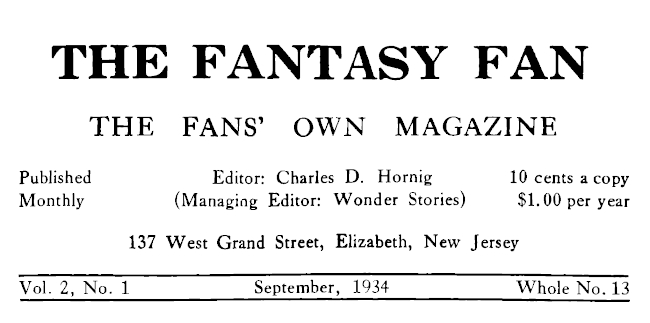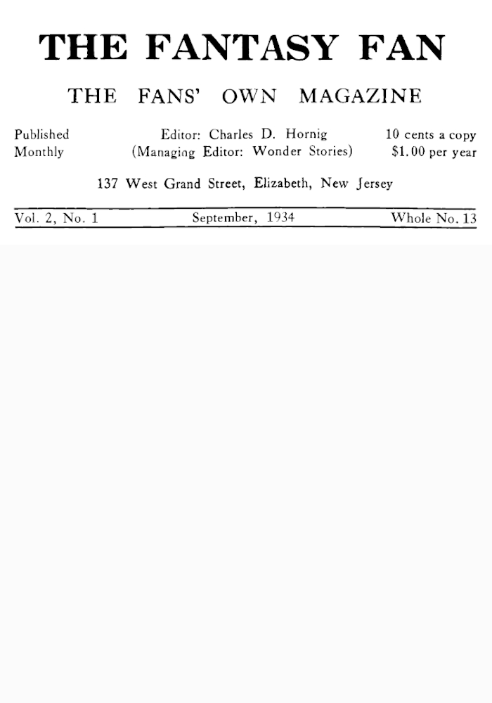 Just because there are no stories in this issue is no indication that we have ceased to publish them. During the past year we have given you brand-new masterpieces by the inimitable Clark Ashton Smith, H. P. Lovecraft, Robert E. Howard, August W. Derleth, Eando Binder, R. H. Barlow, and other great writers, and have many on hand to use during the months to come—several by Smith and Lovecraft, Binder, etc. You won't want to miss these. They have never seen print before and are well up to the standard set by these authors in the more professional magazines. We want to keep THE FANTASY FAN a magazine for the fans, of the fans, and by the fans—the authors being the very best of fans. If you feel capable of writing any fan material, we would be glad to consider it for publication. Payment for such consists of four copies of THE FANTASY FAN of the issue in which the article appears per each page of article, until our magazine is on a paying basis.