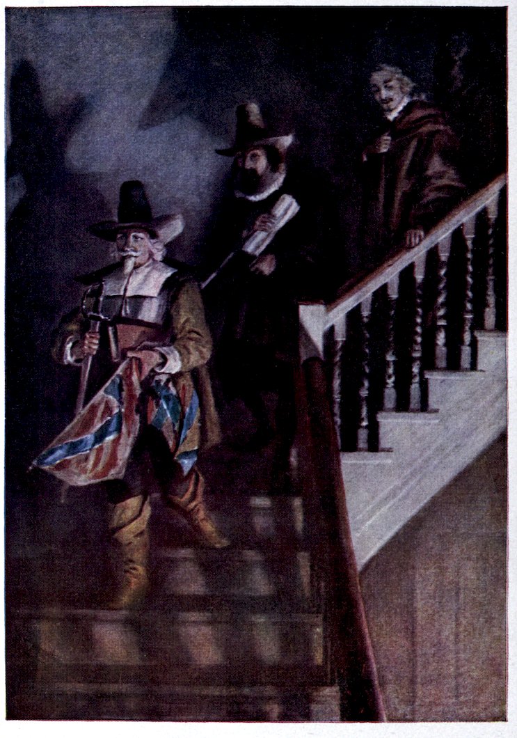 A figure now presented itself, but, among the many fantastic masks that were dispersed through the apartments, none could tell precisely from whence it came. It was a man in an old-fashioned dress of black serge, and having the aspect of a steward, or principal domestic in the household of a nobleman, or great English landholder. This figure advanced to the outer door of the mansion, and throwing both its leaves wide open, withdrew a little to one side and looked back towards the grand staircase, as if expecting some person to descend. At the same time, the music in the street sounded a loud and doleful summons. The eyes of Sir William Howe and his guests being directed to the staircase, there appeared, on the uppermost landing-place that was discernible from the bottom, several personages descending towards the door. The foremost was a man of stern visage, wearing a steeple-crowned hat and a skullcap beneath it; a dark cloak, and huge wrinkled boots that came half-way up his legs. Under his arm was a rolled-up banner, which seemed to be the banner of England, but strangely rent and torn; he had a sword in his right hand, and grasped a Bible in his left. The next figure was of milder aspect, yet full of dignity, wearing a broad ruff, over which descended a beard, a gown of wrought velvet, and a doublet and hose of black satin. He carried a roll of manuscript in his hand. Close behind these two came a young man of very striking countenance and demeanor, with deep thought and contemplation on his brow, and perhaps a flash of enthusiasm in his eye. His garb, like that of his predecessors, was of an antique fashion, and there was a stain of blood upon his ruff. In the same group with these were three or four others, all men of dignity and evident command, and bearing themselves like personages who were accustomed to the gaze of the multitude. It was the idea of the beholders, that these figures went to join the mysterious funeral that had halted in front of the Province House; yet that supposition seemed to be contradicted by the air of triumph with which they waved their hands, as they crossed the threshold and vanished through the portal.