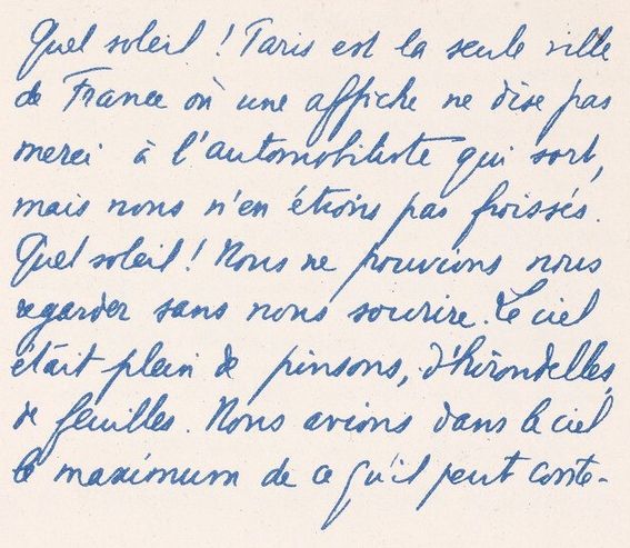 Quel soleil ! Paris est la seule ville de France où une affiche ne dise pas merci à l’automobiliste qui sort, mais nous n’en étions pas froissés. Quel soleil ! Nous ne pouvions nous regarder sans nous sourire. Le ciel était plein de pinsons, d’hirondelles, de feuilles. Nous avions dans le ciel le maximum de ce qu’il peut contenir en été. Quand l’auto effleurait une carriole dont le conducteur remontait pour nous insulter jusqu’à nos ancêtres, quand la sirène effrayait un enfant, ou, suprême joie, un soldat ; quand un heurt nous annonçait que le ruisseau de cette vallée, que le caniveau de ce bourg était franchi, nous nous regardions et nous souriions. Une poule, dix poules nous crurent une minute acharnés à les poursuivre. Quelles folles que les poules ! Que de bonds stupides ! Que d’accidents si on les attelait ! Leur angoisse nous remplit de joie. Un chat effleuré par la roue fit de côté un écart formidable. Gabrielle éclata de rire et me prit la main.
