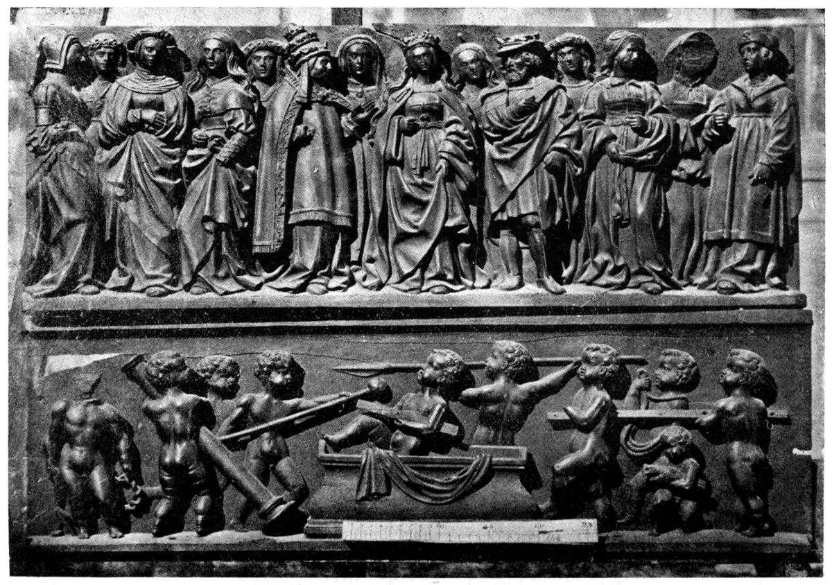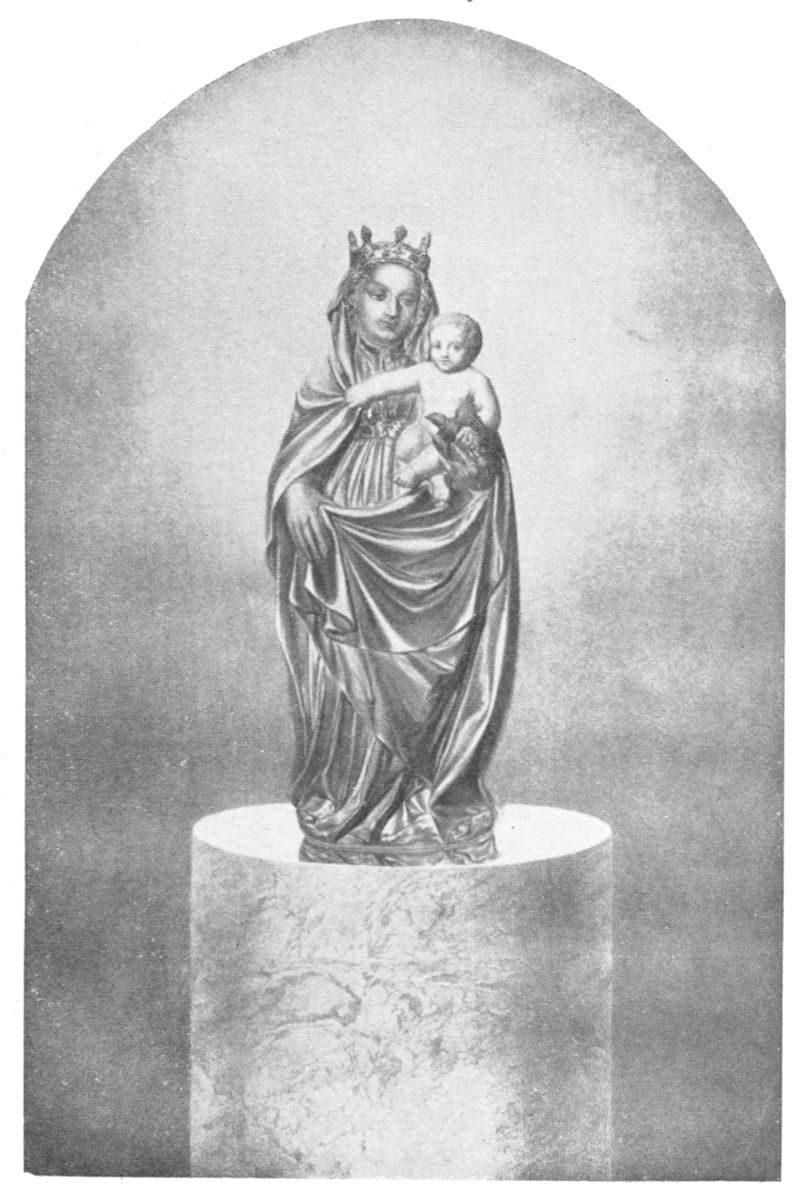 The High Altar of the cathedral is of alabaster and in the Gothic style, the work of one Damian Forment, an early sixteenth-century artist. The lower reliefs, separated by slender pilasters, represent the Espousals of the Virgin, the Annunciation, the Visitation, the Nativity, the Adoration of the Magi, the Crucifixion, and the Resurrection. Above, in canopied niches, are the Assumption, the Nativity, and the Presentation. The canopies are richly adorned with the figures of saints. At the sides are two large statues of St. James and St. Braulio—objects of special devotion—and at the apex of the altar-screen are two angels supporting Our Lady of the Pillar. The whole is undoubtedly the finest work of art in the cathedral.